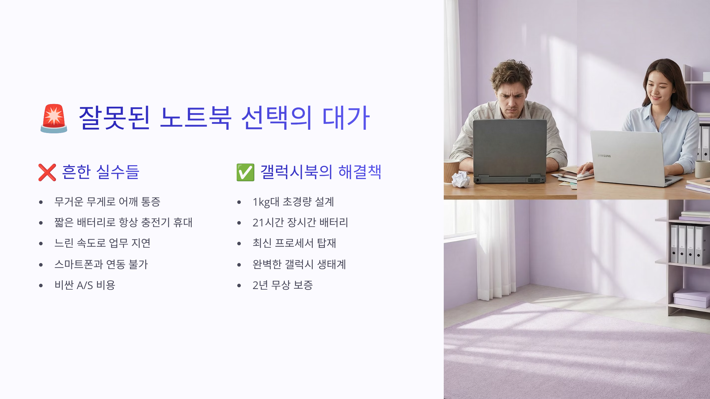 이런 문제들을 겪지 않으려면 처음부터 제대로 된 노트북을 선택해야 해요. 갤럭시북은 이 모든 문제를 해결한 완벽한 설루션이랍니다. 삼성의 기술력과 품질 관리로 안정성도 보장되고, A/S도 전국 어디서나 받을 수 있어요!