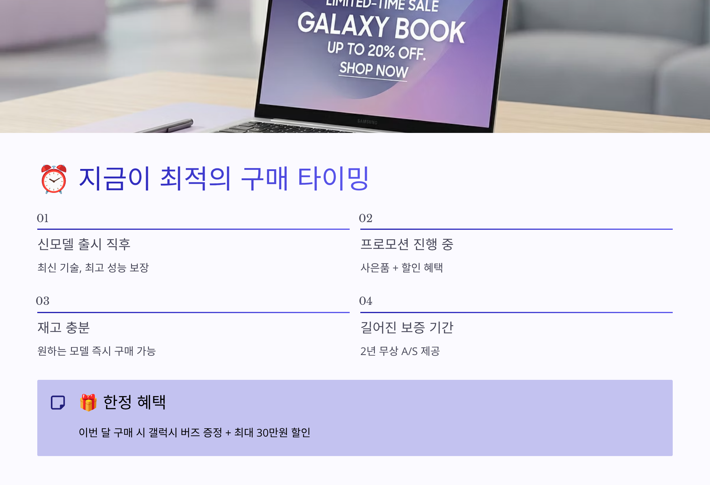 갤럭시북은 단순한 노트북이 아니라 당신의 디지털 라이프를 완성하는 핵심 도구예요. 지금 바로 갤럭시북과 함께 더 나은 내일을 시작하세요! 🚀