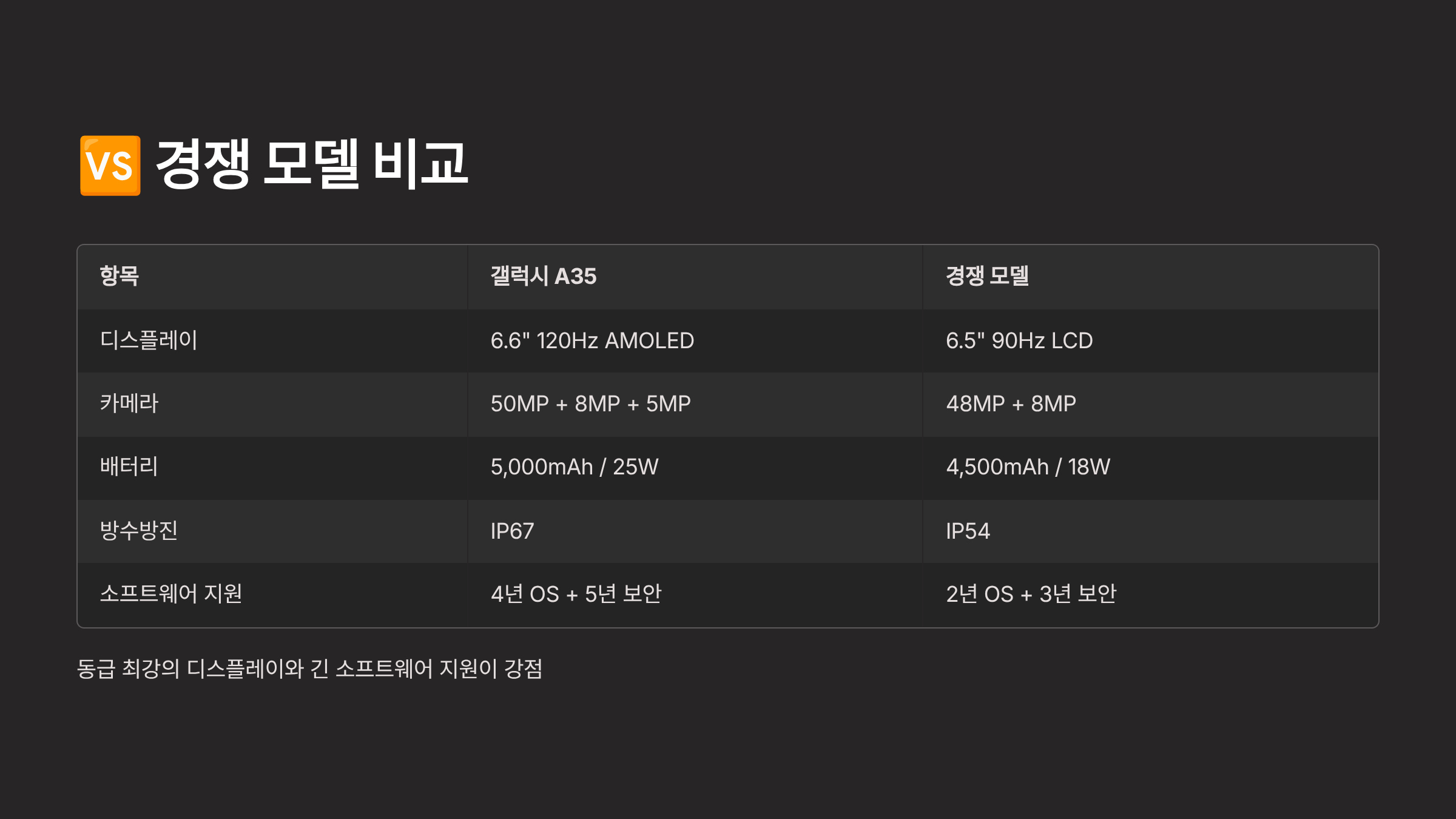 같은 삼성 내에서 갤럭시 A54와 비교하면 프로세서 성능은 비슷하지만, A35가 더 최신 모델이라 소프트웨어 지원 기간이 길어요. 디자인도 A35가 더 세련되었고, 가격도 더 합리적이에요. A54를 고려 중이라면 차라리 A35를 선택하는 게 나을 것 같아요.