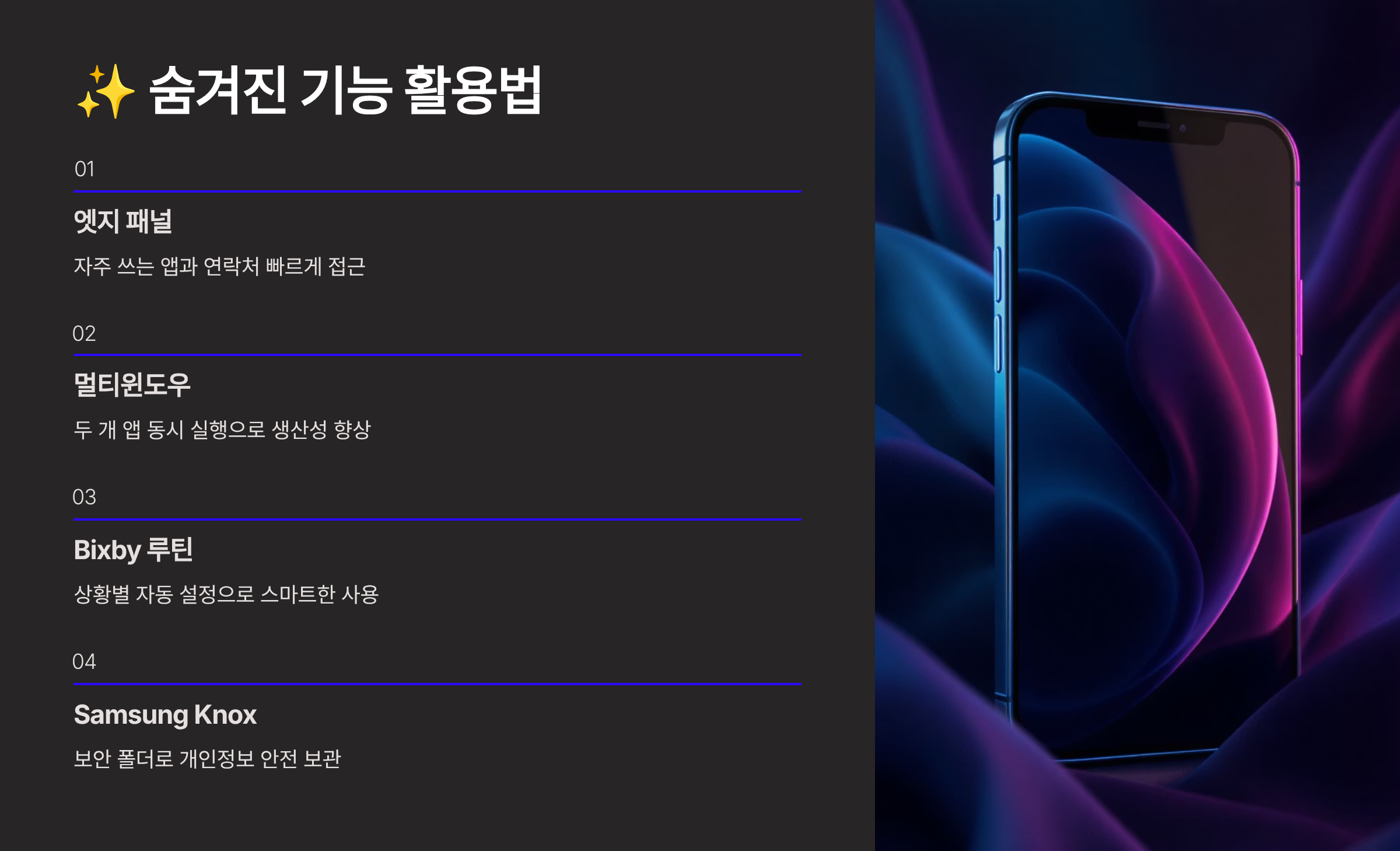 갤럭시 A35의 숨은 기능들을 모두 활용하면 플래그십 못지않은 사용 경험을 할 수 있어요. 특히 One UI의 다양한 커스터마이징 옵션들은 정말 매력적이에요. 시간을 들여 설정을 최적화하면 나만의 완벽한 스마트폰을 만들 수 있답니다! ✨