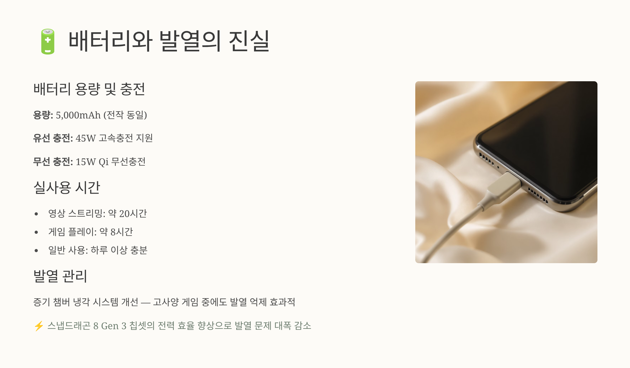 충전 속도도 빨라졌어요. 45W 고속 충전으로 30분이면 65%까지 충전되고, 완충까지는 약 1시간 10분 걸려요. 무선 충전은 15W를 지원하는데, 자기 전에 충전 패드에 올려두면 아침에 100%예요. 역방향 무선 충전으로 갤럭시 버즈나 워치도 충전할 수 있어서 편해요!