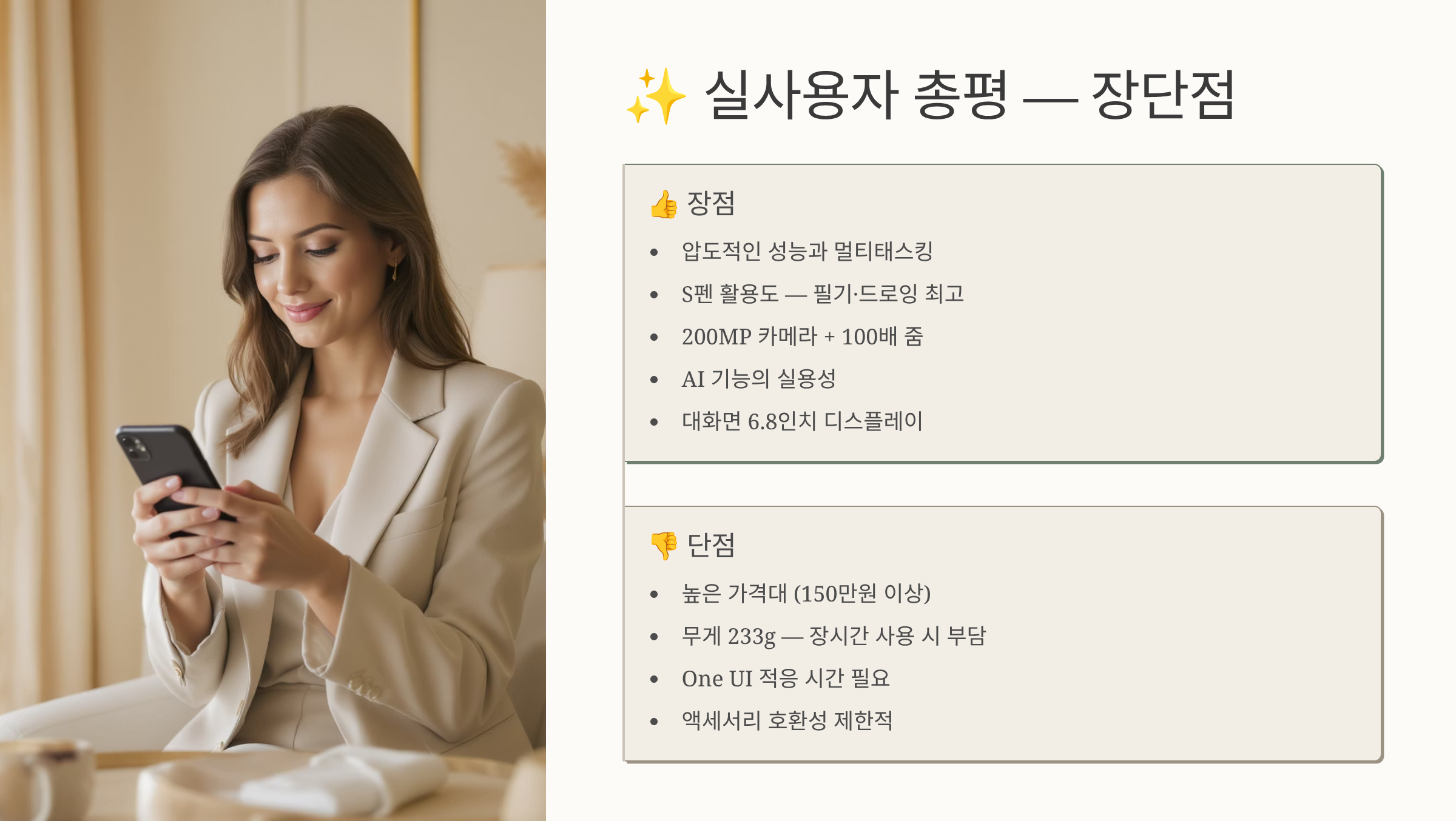 단점도 있어요. 첫째로 가격이 정말 비싸요. 플래그십이라지만 200만 원에 가까운 가격은 부담스럽죠. 할인받아도 100만 원 이상이니까 신중하게 결정해야 해요. 하지만 5년은 거뜬히 쓸 수 있는 스펙이라 장기적으로 보면 가성비가 나쁘지 않아요!