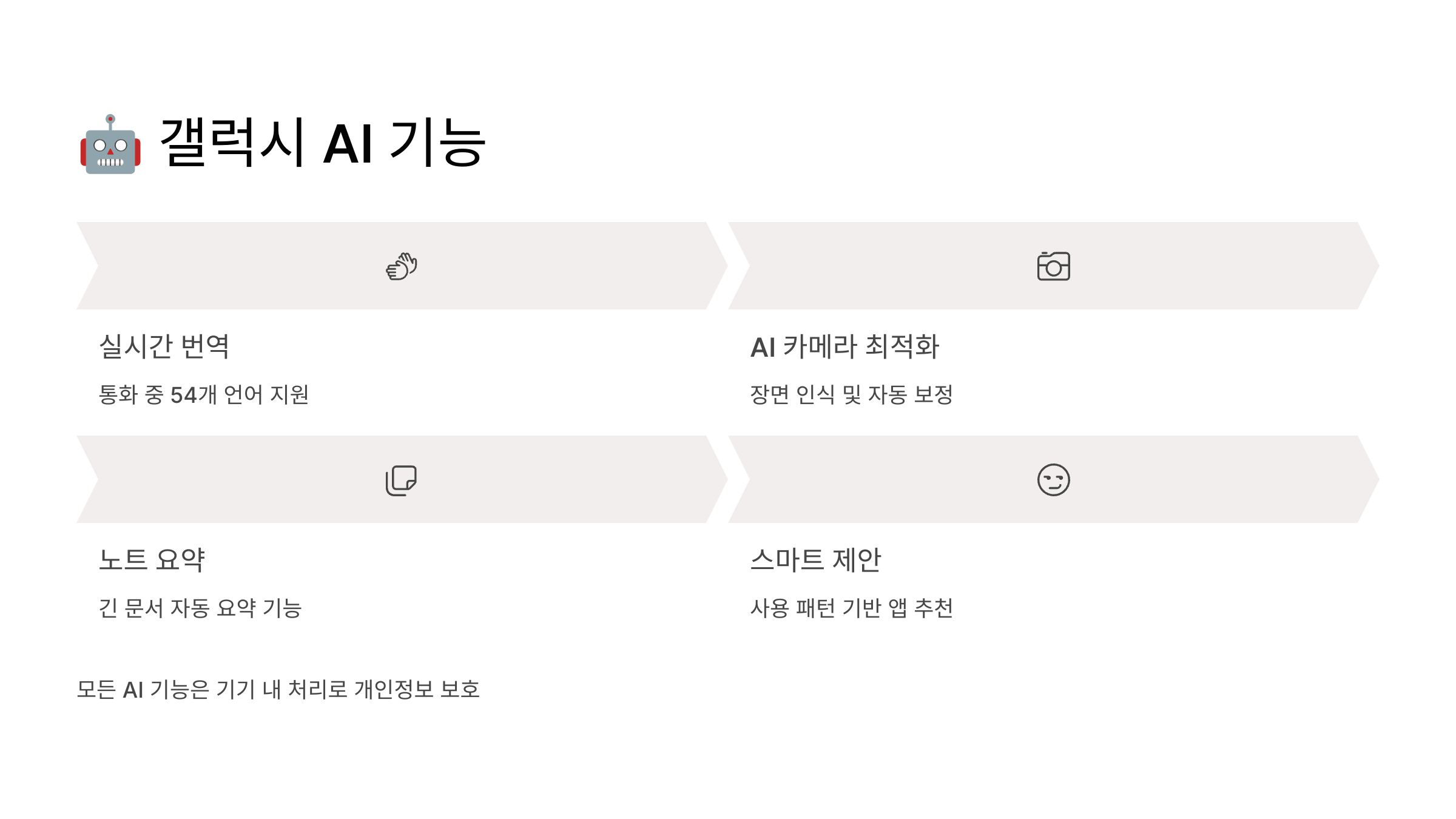 | AI 기능 | 기본 갤럭시 AI | 강화된 갤럭시 AI | 2배 빠른 처리 |