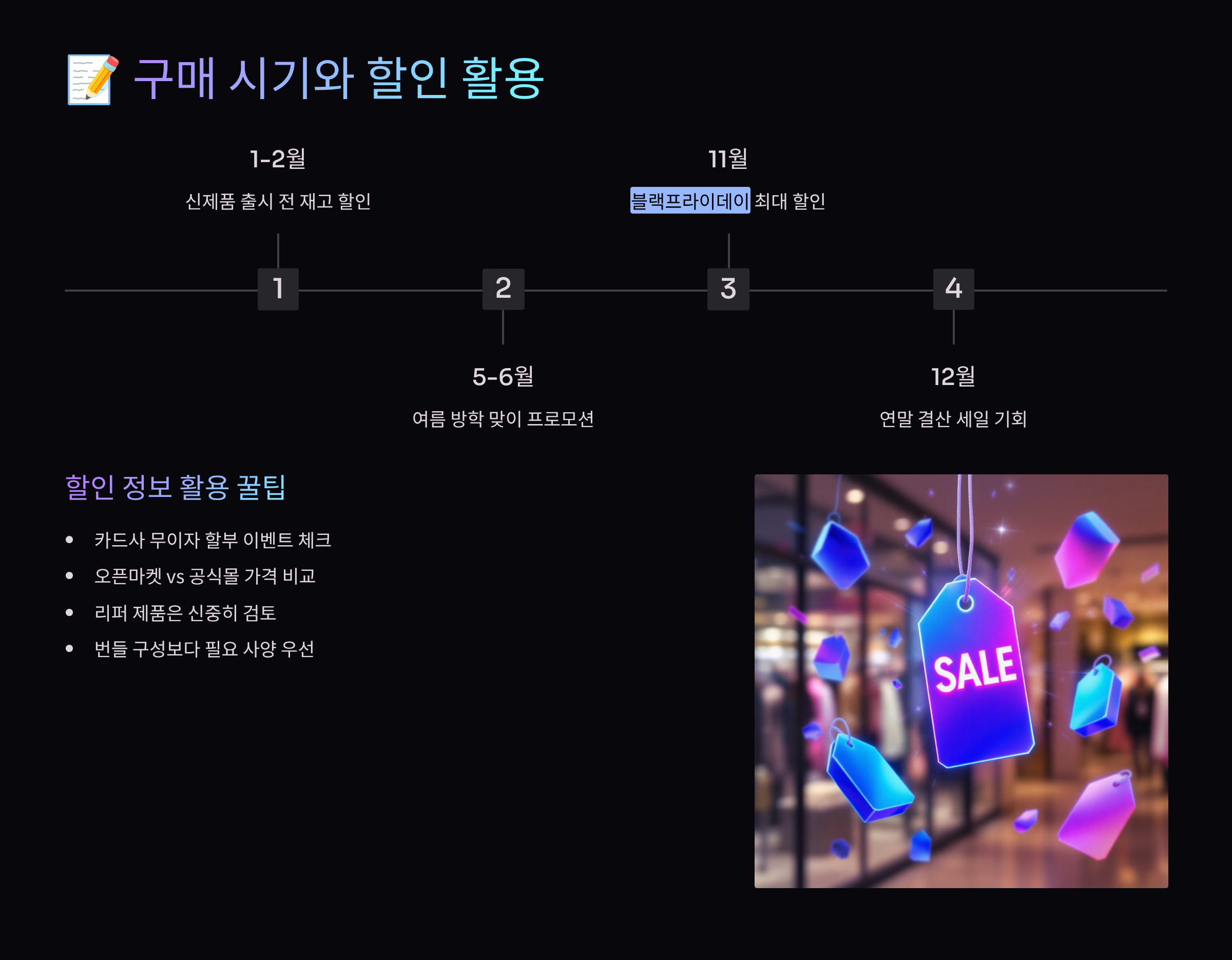 | 6-7월 | 연중 세일 | 20-30% | 구형 모델 처분 |