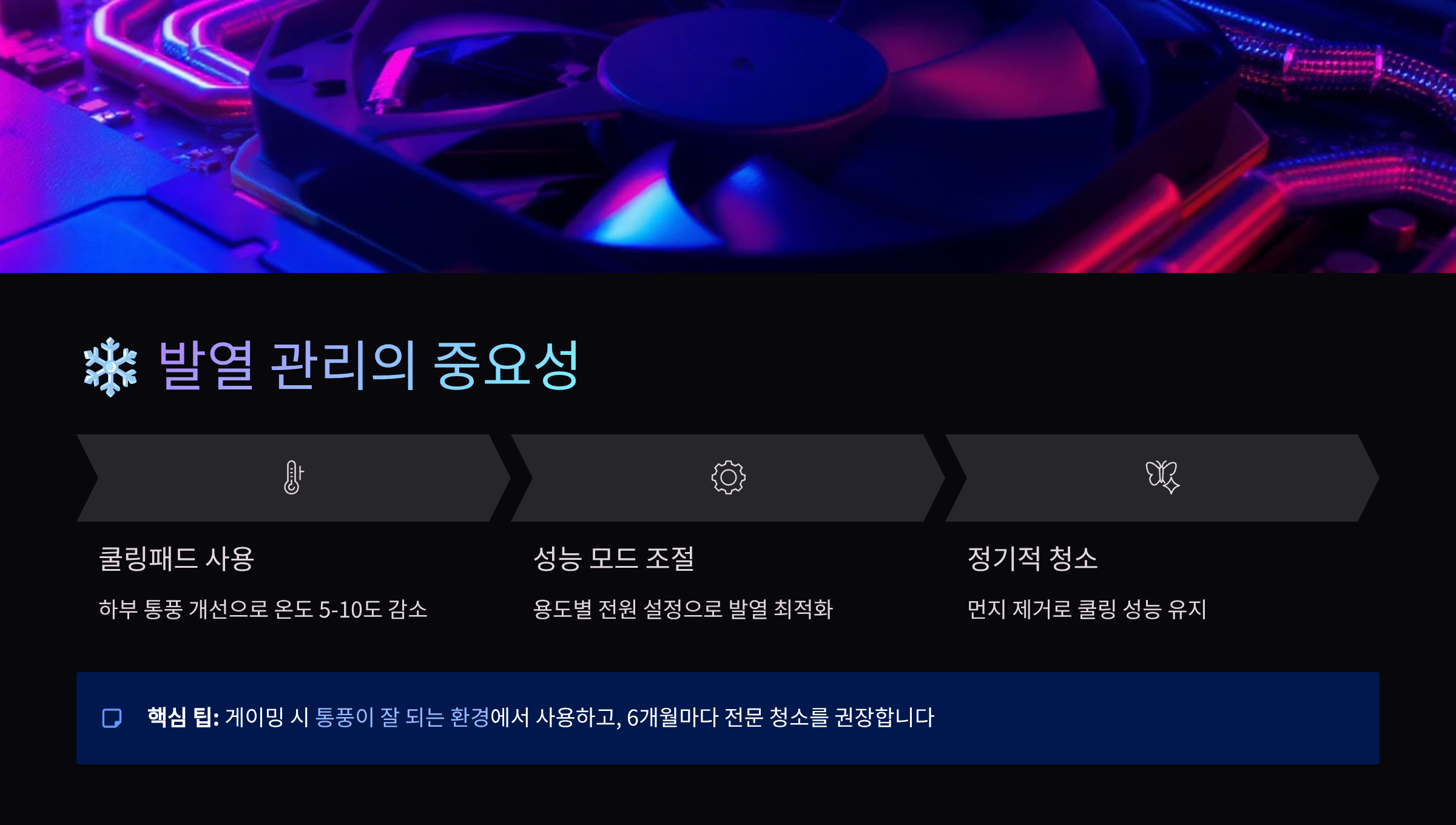 게이밍노트북의 발열 관리는 성능과 수명에 직접적인 영향을 미쳐요. CPU와 GPU가 고온에 도달하면 서멀 스로틀링이 발생하여 성능이 급격히 떨어지게 돼요. 일반적으로 CPU는 95도, GPU는 87도가 한계 온도인데, 이보다 낮게 유지하는 것이 중요해요. 적절한 온도는 게임 중 CPU 80도, GPU 75도 이하예요. 이 온도를 유지하면 안정적인 성능과 긴 수명을 보장받을 수 있답니다.