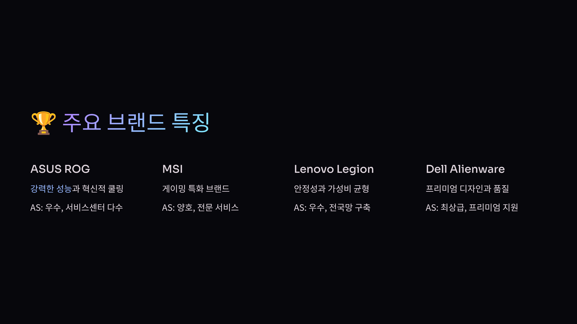 국내 브랜드인 한성컴퓨터와 GIGABYTE도 주목할 만해요. 한성컴퓨터는 동일 스펙 대비 가장 저렴한 가격을 제공하고, 커스터마이징 옵션이 다양해요. GIGABYTE AORUS와 AERO 시리즈는 우수한 디스플레이와 쿨링 성능으로 인기가 있어요. 두 브랜드 모두 국내 AS가 빠르고 편리하다는 장점이 있어요.