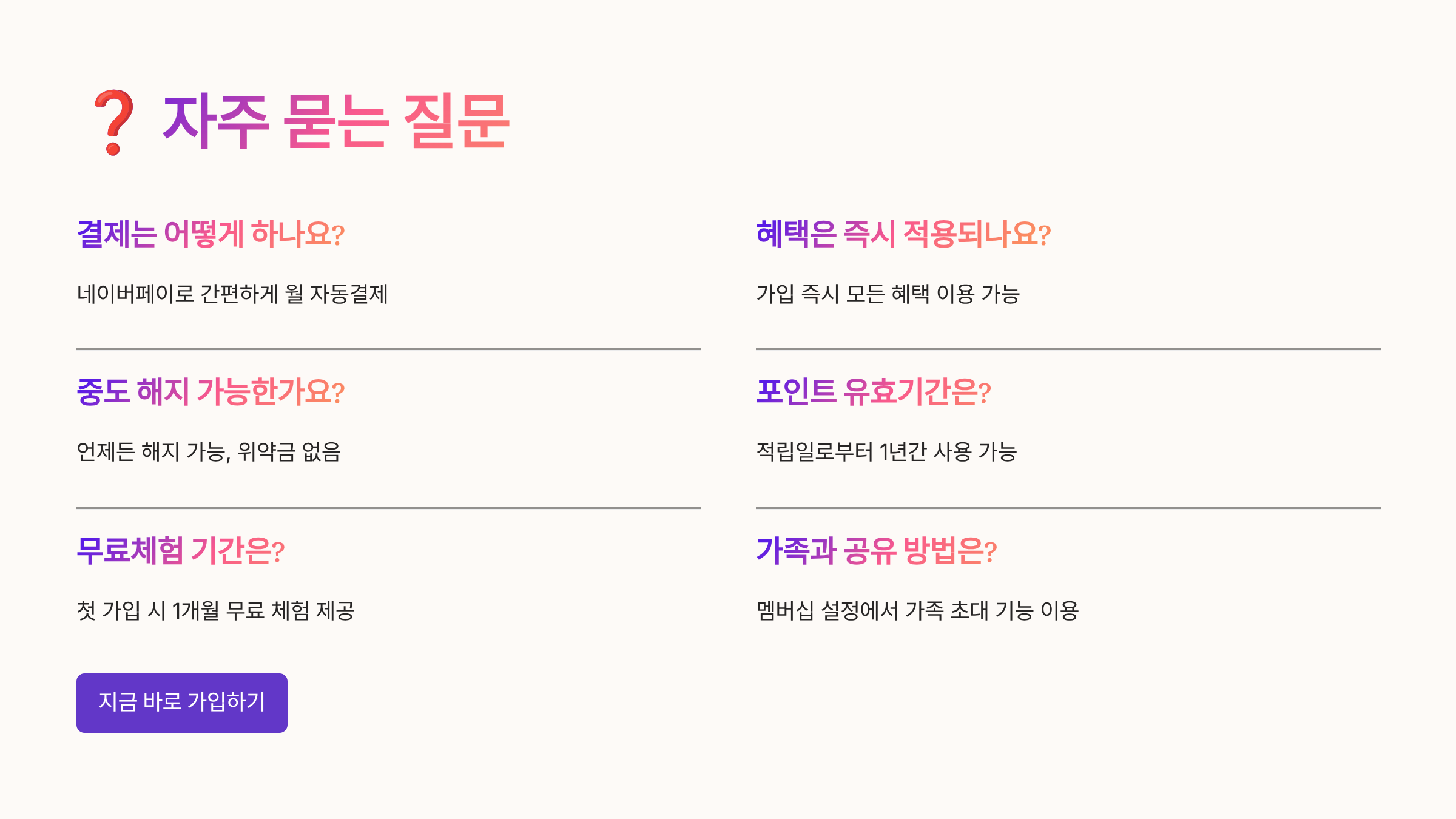 친구 추천 포인트도 있어요. 플러스 회원이 친구를 초대해서 가입시키면 양쪽 모두 포인트를 받을 수 있답니다. 가족이나 친구들과 함께 가입하면 서로 윈윈 할 수 있는 좋은 기회예요. 추천받은 친구도 첫 달 무료 혜택을 받을 수 있으니 부담 없이 권할 수 있답니다.