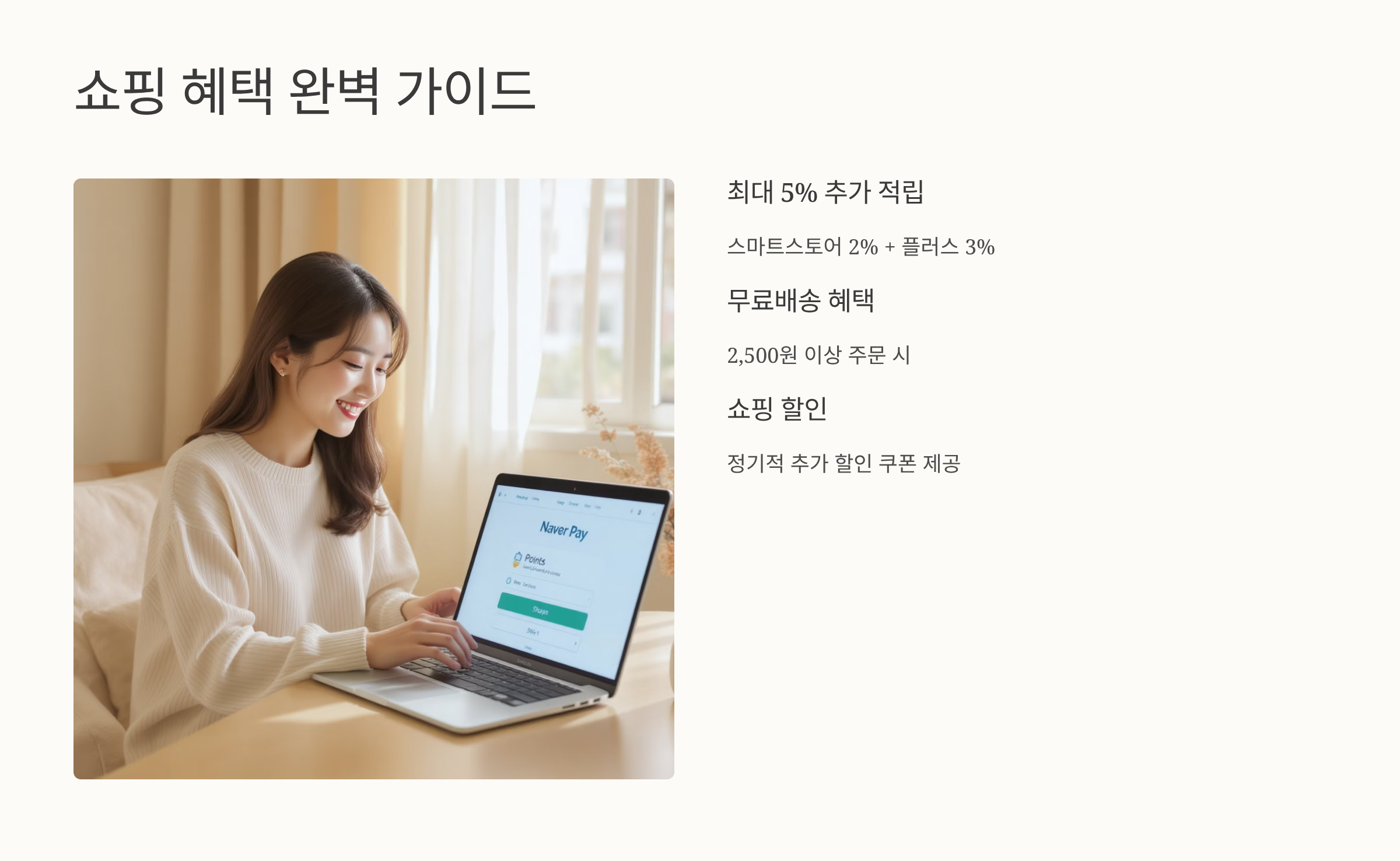 네이버플러스 멤버십의 가장 큰 매력은 역시 쇼핑 혜택이에요! 네이버 쇼핑에서 구매할 때마다 최대 5%의 네이버페이 포인트를 적립받을 수 있답니다. 일반 회원은 보통 0.5~1% 정도만 적립되는데, 멤버십 회원은 5배나 많은 포인트를 받을 수 있어요. 월 20만 원만 쇼핑해도 1만 포인트를 적립받을 수 있으니 정말 큰 혜택이죠! 🛍️