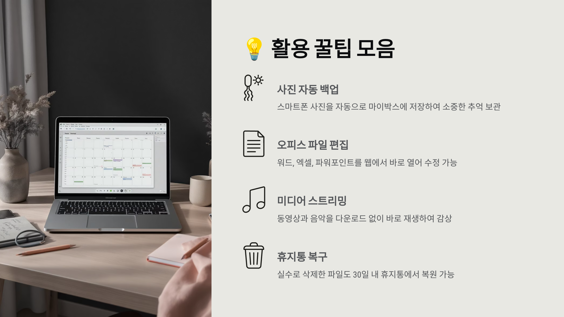 마이박스는 단순한 파일 저장소를 넘어서 문서 작업, 사진 백업, 동영상 스트리밍, 그리고 팀 협업까지 가능한 올인원 서비스로 진화했어요. 특히 네이버의 다른 서비스들과 연동이 잘 되어 있어서 한국 사용자들에게 정말 편리한 선택지가 되고 있답니다.