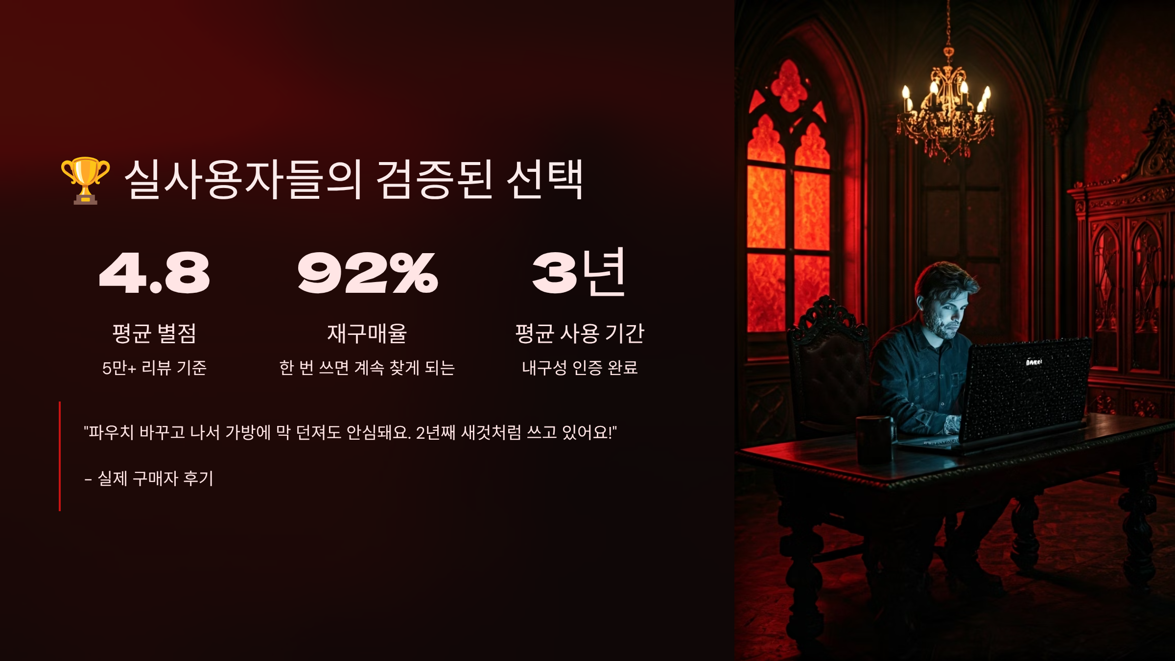 수리비를 생각하면 파우치 가격은 정말 저렴해요. 화면 교체 80만 원, 키보드 교체 20만 원, 외관 손상으로 인한 감가 30만 원... 이런 비용들과 비교하면 3만 원짜리 파우치는 정말 현명한 투자예요. 보험처럼 생각하시면 돼요.