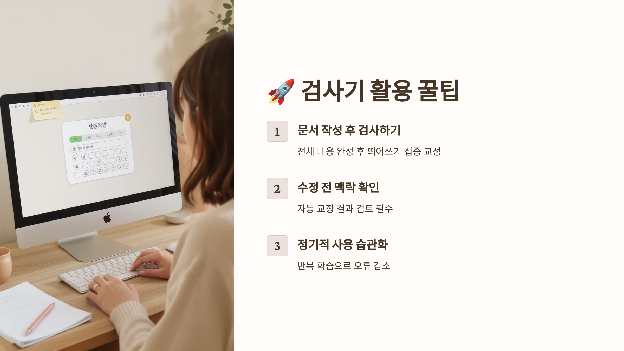 검사기 사용 시 주의할 점도 있어요. 모든 제안을 무조건 따르지 말고, 문맥을 고려해서 판단하세요. 가끔 검사기도 실수를 하거나, 특수한 상황을 인식하지 못할 때가 있거든요. 특히 전문 용어나 고유명사가 포함된 문장은 더욱 신중하게 검토해야 해요! 🔍