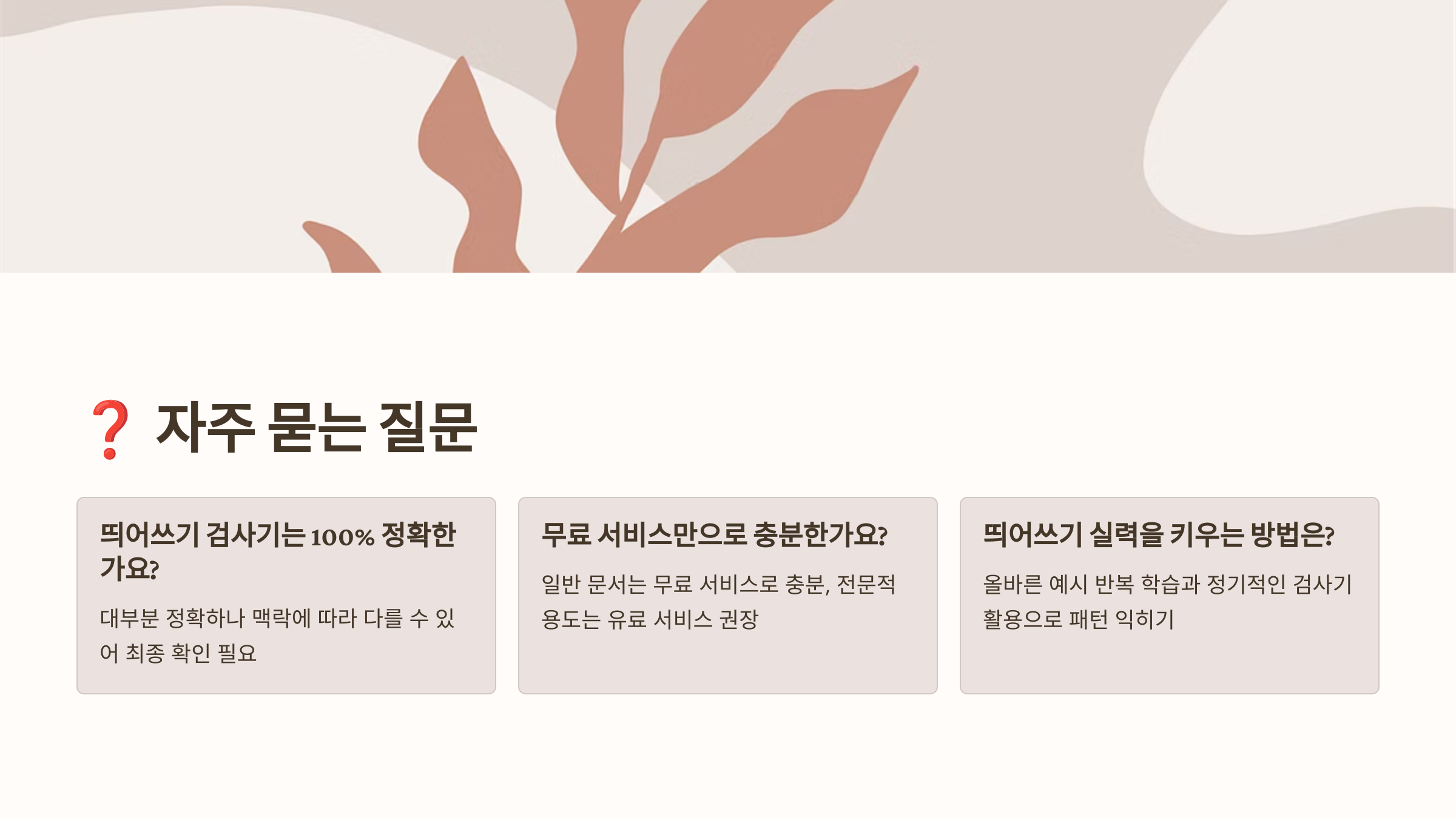 이렇게 자주 틀리는 띄어쓰기를 정리해 봤는데요, 한 번에 다 외우려고 하지 마세요. 글을 쓸 때마다 하나씩 신경 쓰다 보면 자연스럽게 익숙해질 거예요. 그리고 항상 검사기를 활용해서 확인하는 습관을 들이세요! 🎯