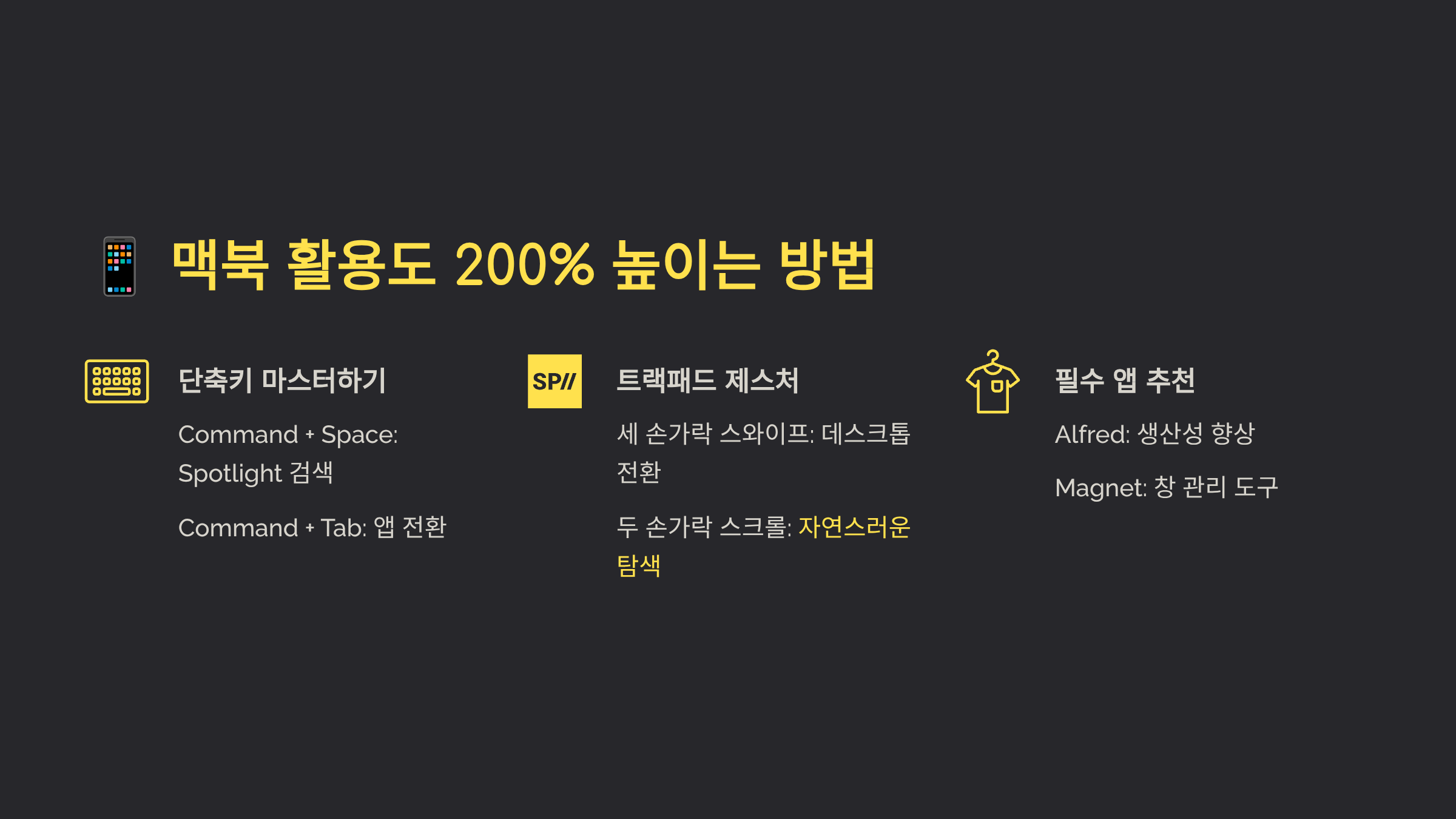 단축키를 익히는 것도 중요해요. Cmd+Space로 스포트라이트를 열어 빠르게 앱을 실행하고, Cmd+Tab으로 앱을 전환하며, Cmd+Q로 앱을 완전히 종료할 수 있어요. Option+Cmd+Esc는 응답 없는 앱을 강제 종료할 때 사용하고, Shift+Cmd+3은 전체 화면 스크린숏, Shift+Cmd+4는 영역 선택 스크린숏을 찍을 때 써요.
