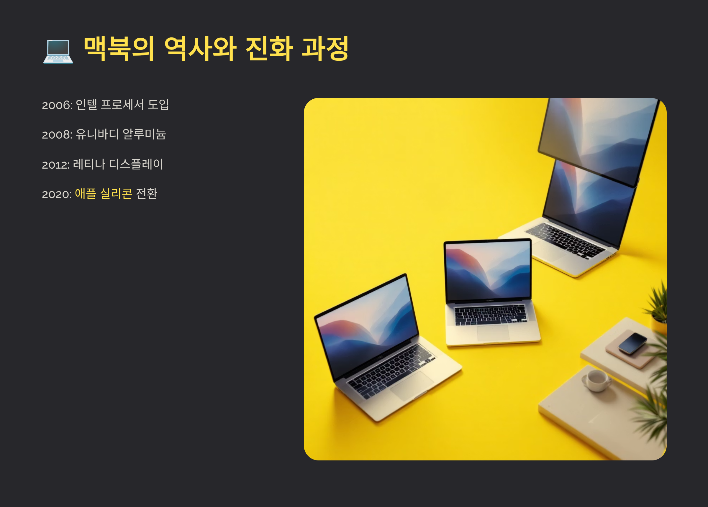 맥북은 2006년 처음 등장한 이후로 전 세계 크리에이터와 전문가들의 필수 도구가 되었어요. 애플이 만든 이 노트북은 단순히 컴퓨터를 넘어서 하나의 문화 아이콘이 되었답니다. 특히 스티브 잡스가 무대에서 맥북 에어를 서류 봉투에서 꺼내던 순간은 IT 역사에 길이 남을 장면이에요.