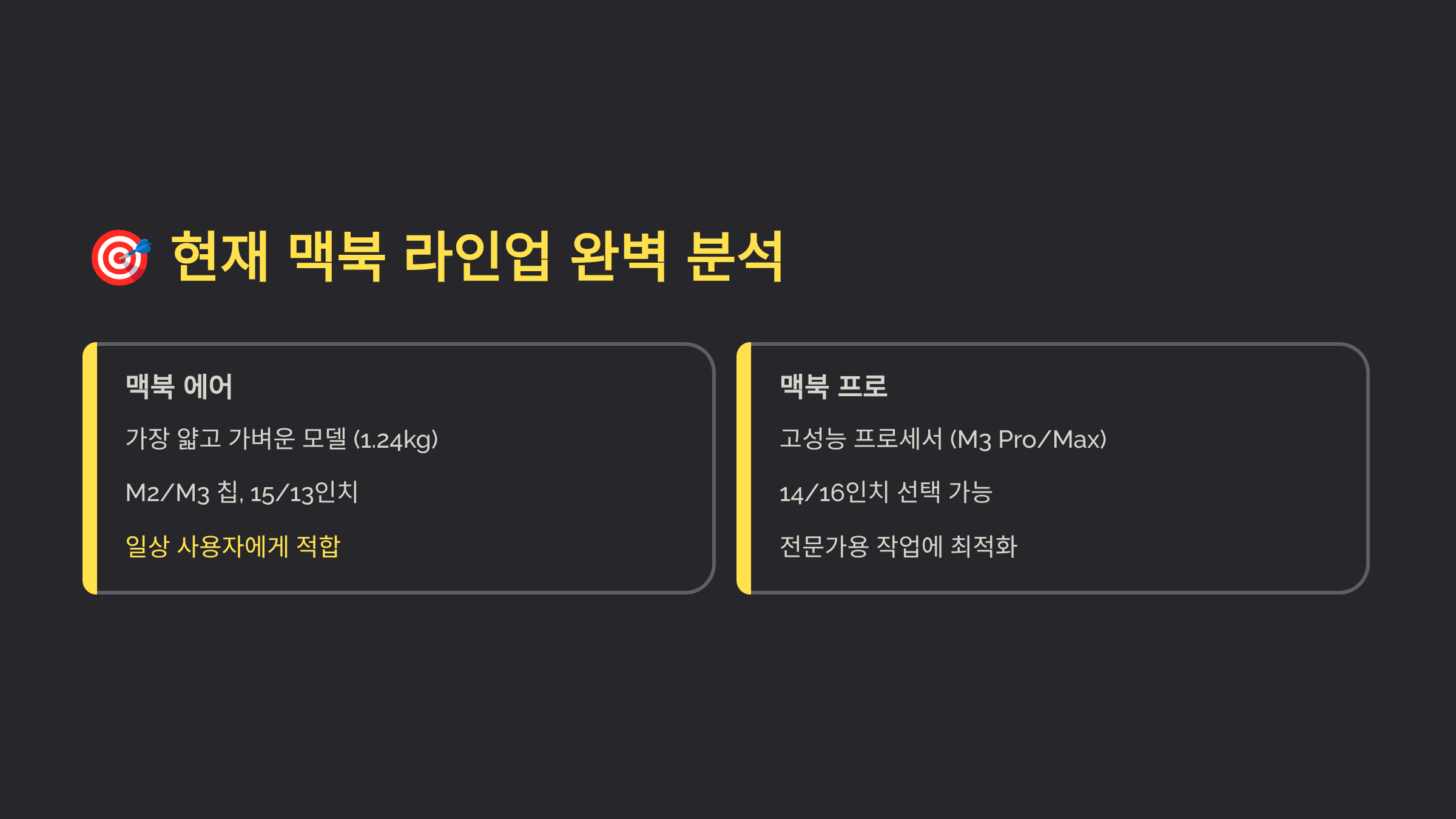 2025년 현재 애플의 맥북 라인업은 크게 맥북 에어와 맥북 프로로 나뉘어요. 각 모델은 M3, M3 프로, M3 맥스 칩을 탑재하고 있으며, 사용자의 필요에 따라 선택할 수 있는 다양한 옵션을 제공하고 있답니다. 13인치와 15인치 맥북 에어는 일반 사용자와 학생들에게 인기가 많고, 14인치와 16인치 맥북 프로는 전문가들이 선호해요.