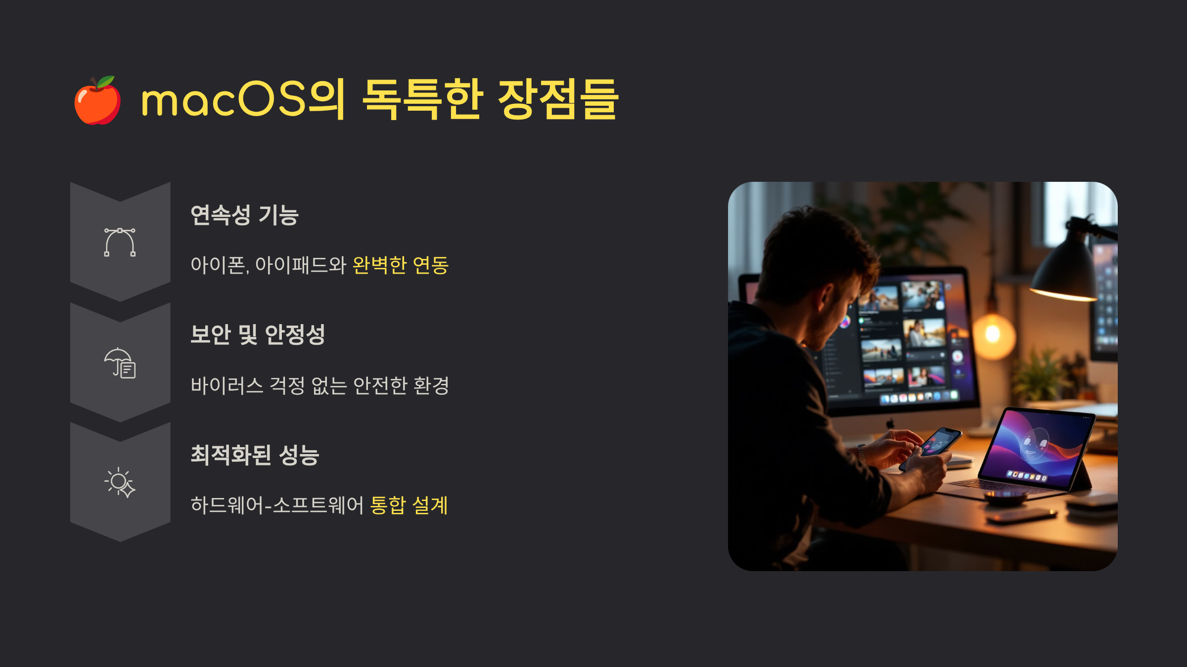 macOS는 맥북을 특별하게 만드는 핵심 요소예요. 유닉스 기반의 안정적인 시스템에 직관적인 인터페이스를 결합한 macOS는 초보자도 쉽게 사용할 수 있으면서 전문가들에게도 강력한 도구를 제공한답니다. 특히 애플 생태계와의 연동은 다른 운영체제가 따라올 수 없는 수준이에요.