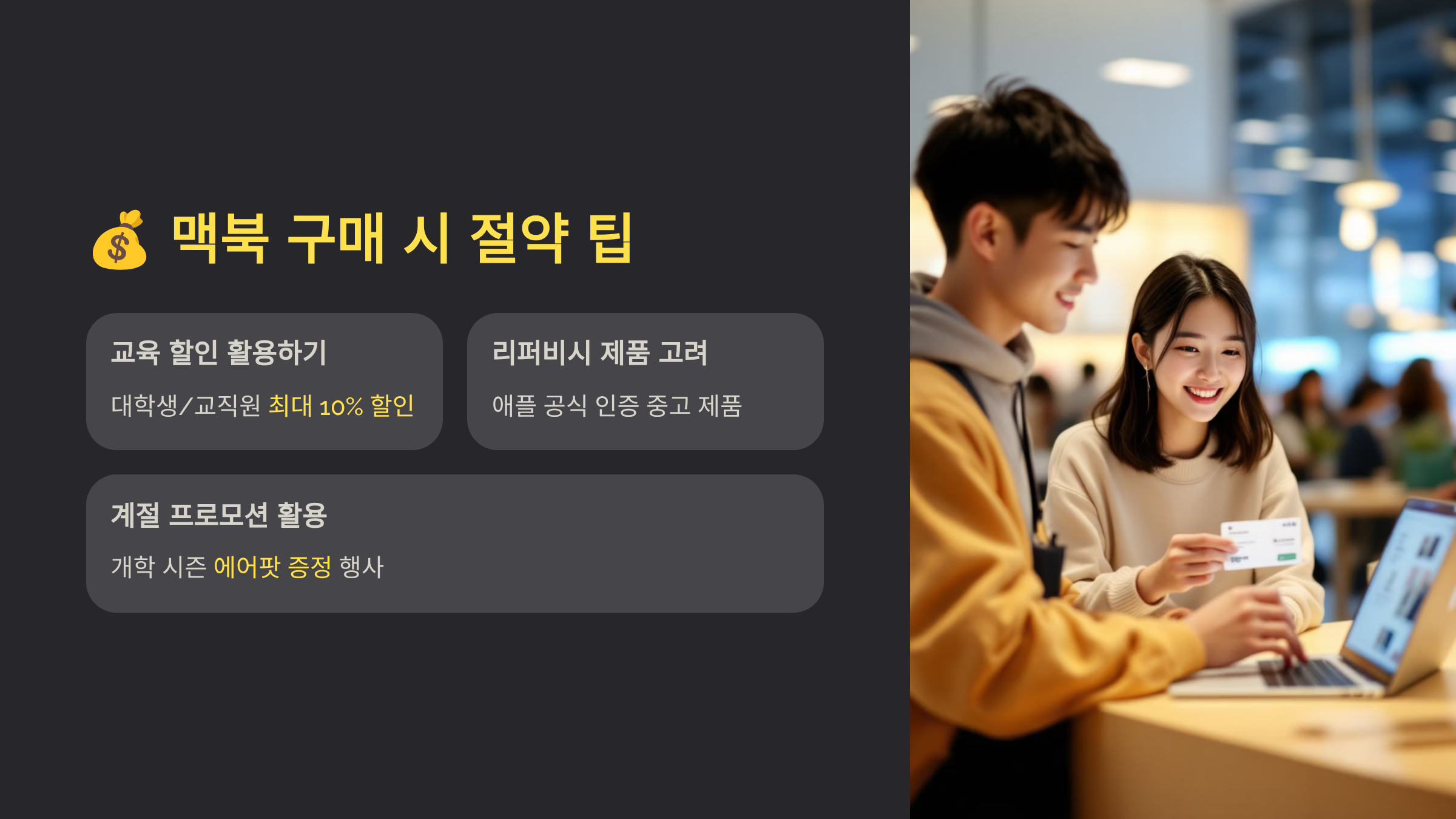맥북을 저렴하게 구매하는 가장 좋은 방법은 교육 할인을 받는 거예요. 대학생, 대학원생, 교직원, 학부모까지 교육 할인 대상이 되며, 최대 10% 할인을 받을 수 있답니다. 매년 여름에는 백투스쿨 프로모션으로 에어팟이나 애플 펜슬 같은 액세서리를 무료로 제공하기도 해요. UNiDAYS나 학교 이메일로 인증하면 바로 할인을 받을 수 있죠.