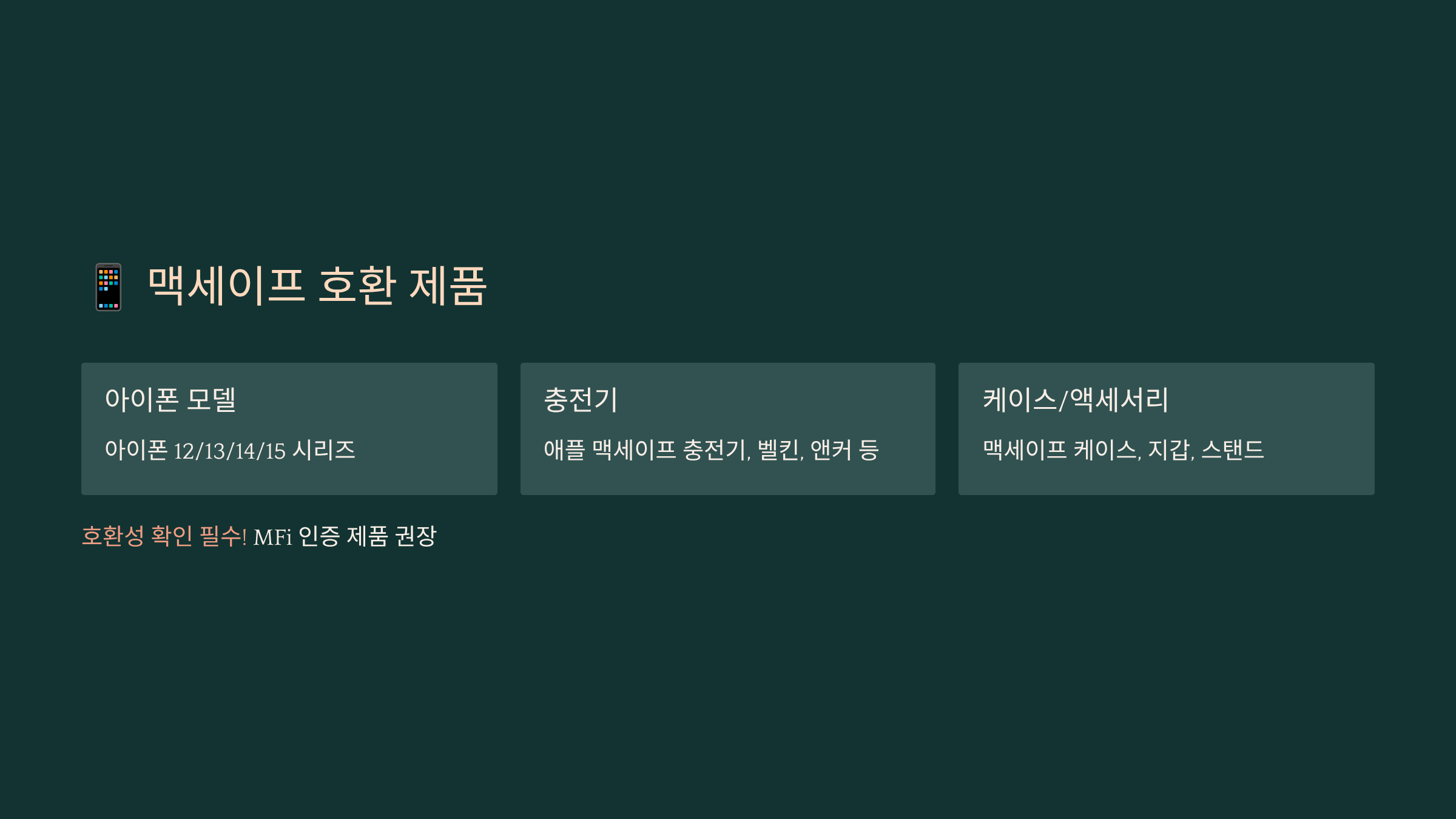 맥세이프를 완벽하게 지원하는 아이폰은 12 시리즈부터예요. 아이폰 12, 12 미니, 12 프로, 12 프로 맥스가 첫 번째 맥세이프 폰이었고, 이후 13, 14, 15 시리즈까지 모두 맥세이프를 지원한답니다. 각 시리즈마다 자석 배치와 강도가 조금씩 개선되었어요. 특히 아이폰 15 시리즈는 Qi2 표준도 함께 지원해서 더 많은 액세서리와 호환돼요.