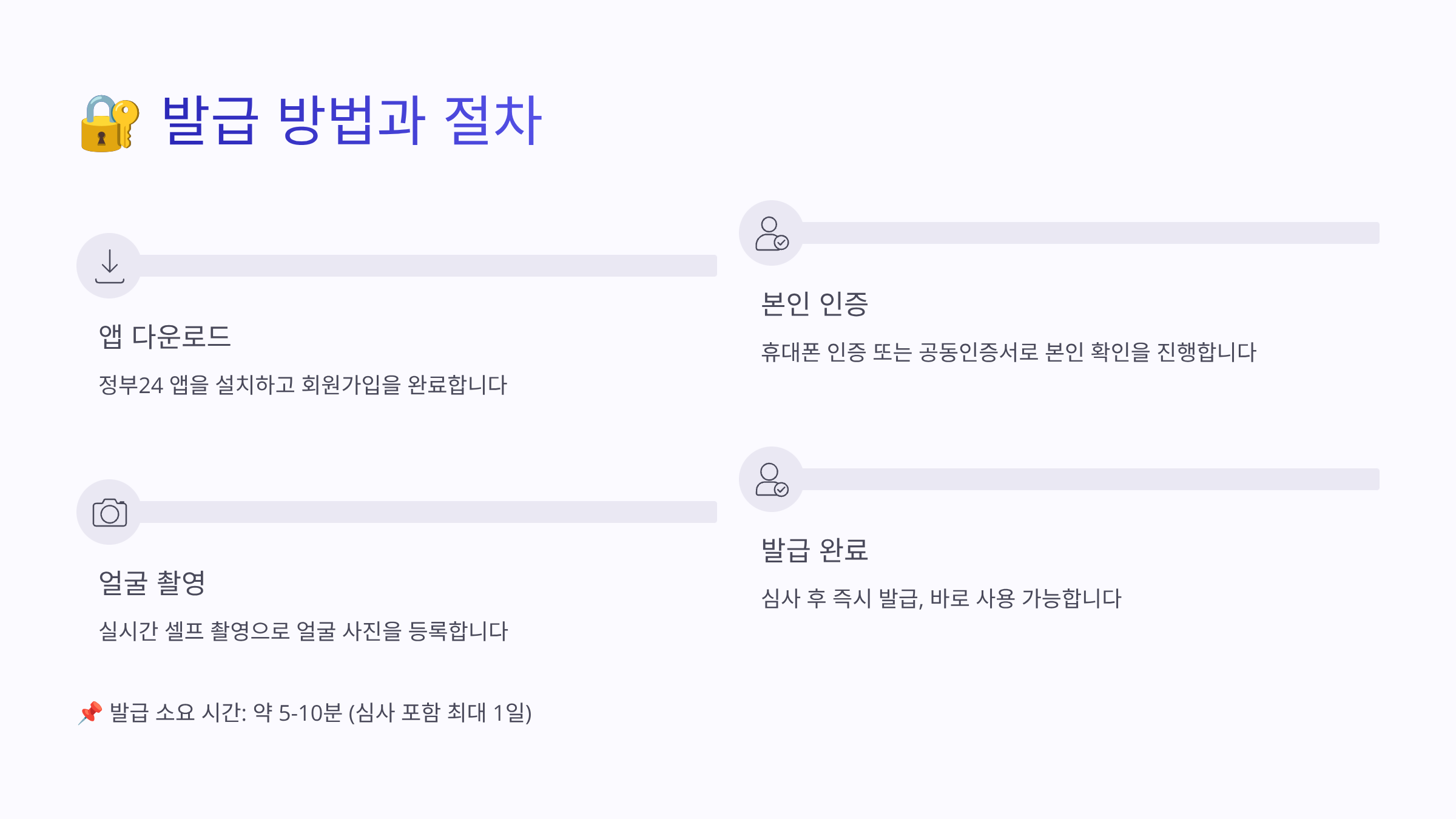 발급 절차는 크게 4단계로 나뉘어요. 첫째, 앱 설치 및 회원가입. 둘째, 본인인증. 셋째, 모바일 주민등록증 신청. 넷째, 생체정보 등록이에요. 전체 과정이 10분 내외로 끝나니까 점심시간이나 출퇴근길에도 충분히 할 수 있답니다.