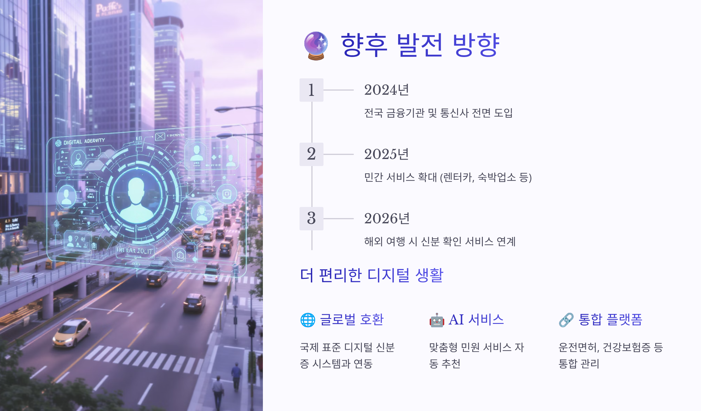 메타버스와의 연동도 준비하고 있어요. 가상공간에서의 신원 확인 수단으로 활용될 예정이며, NFT 형태로 발급받을 수도 있을 거랍니다. Web3.0 시대의 핵심 인프라가 될 전망이에요. 🚀
