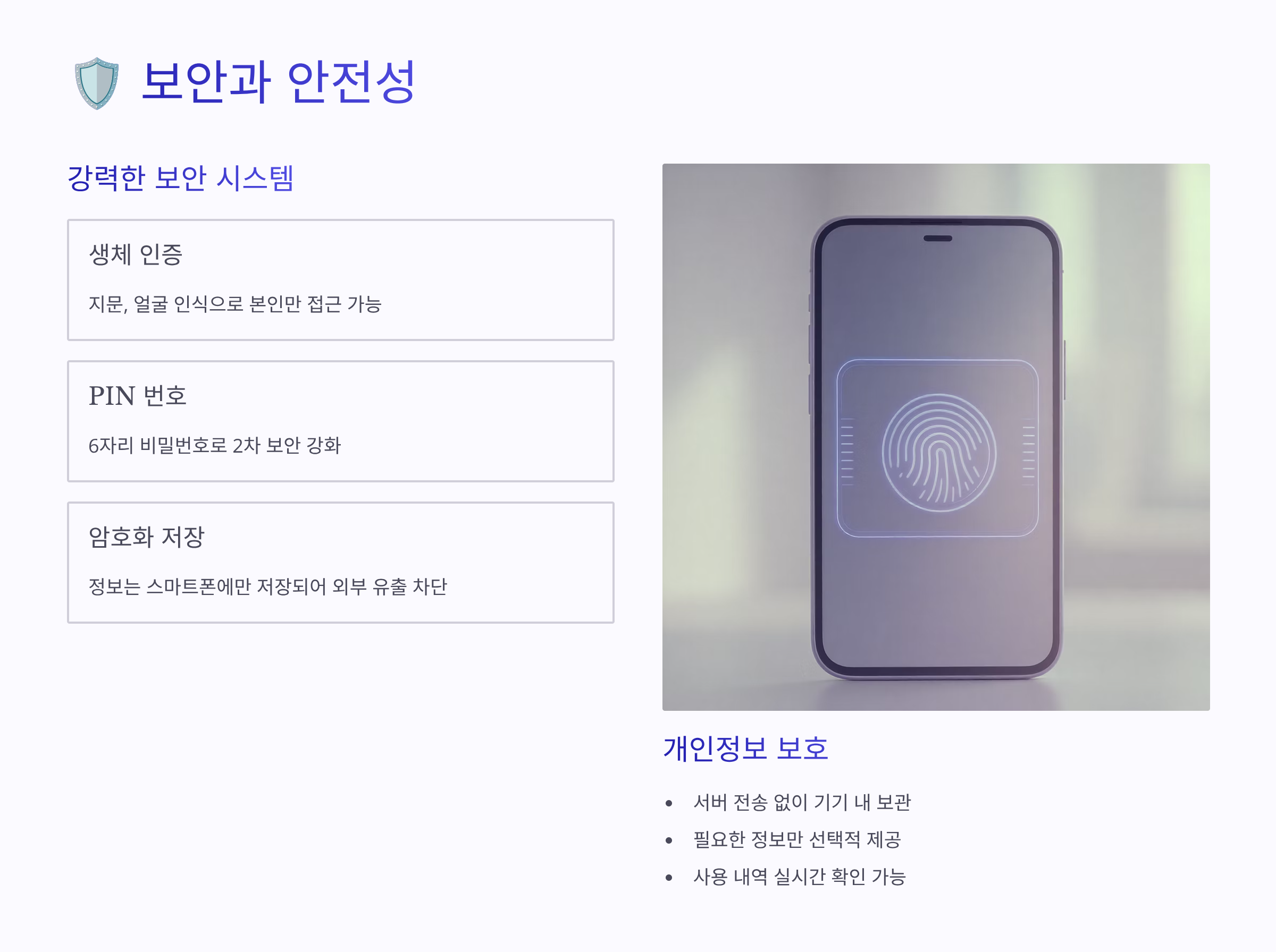 | 보안 | 분실 시 위험 | 생체인증 보호 |