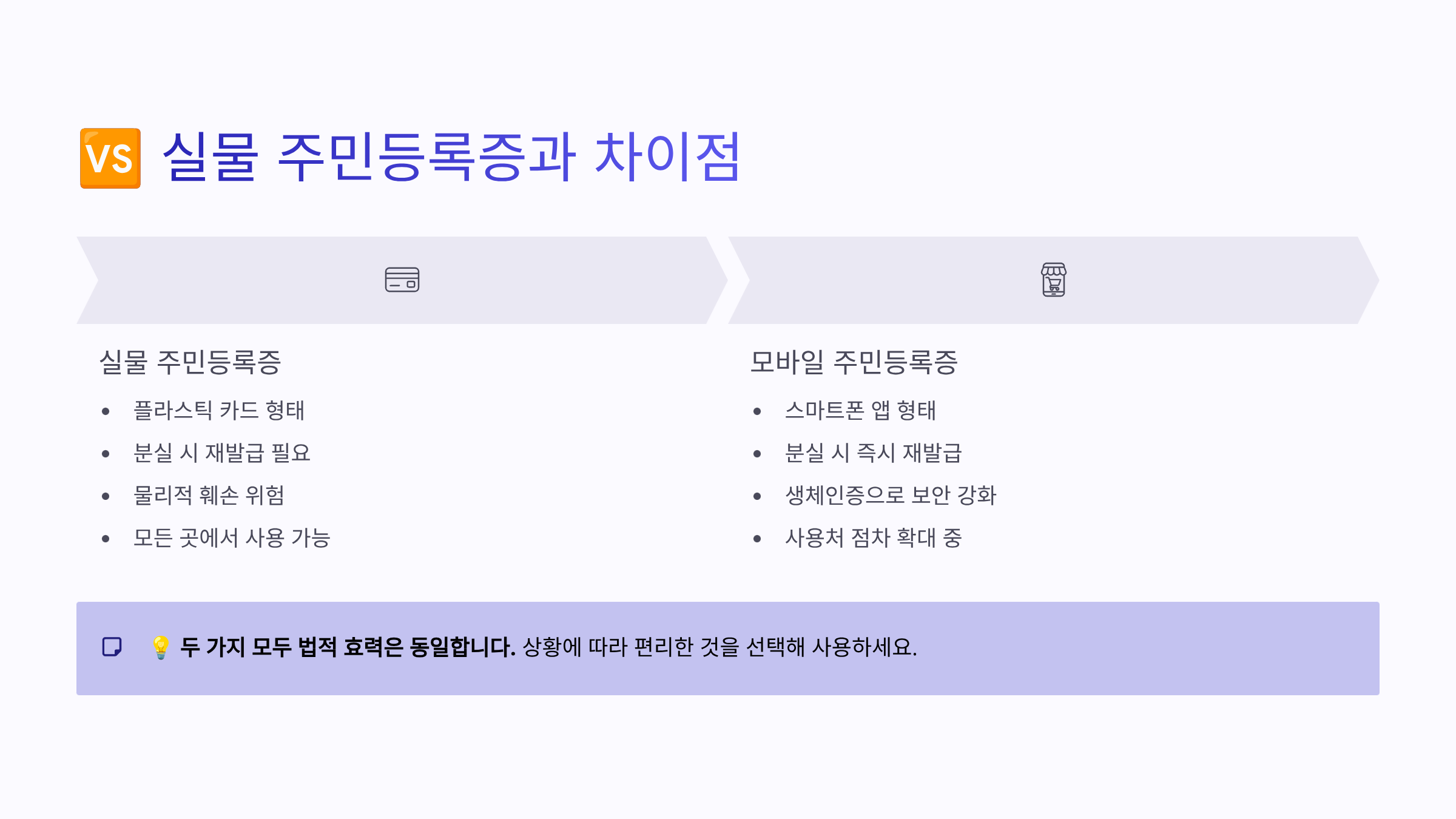 활용 범위에서도 차이가 있어요. 실물은 오프라인에서만 사용 가능하지만, 모바일은 온라인과 오프라인 모두에서 활용할 수 있어요. 온라인 쇼핑, 금융 거래, 전자 계약 등에서 특히 유용하답니다.