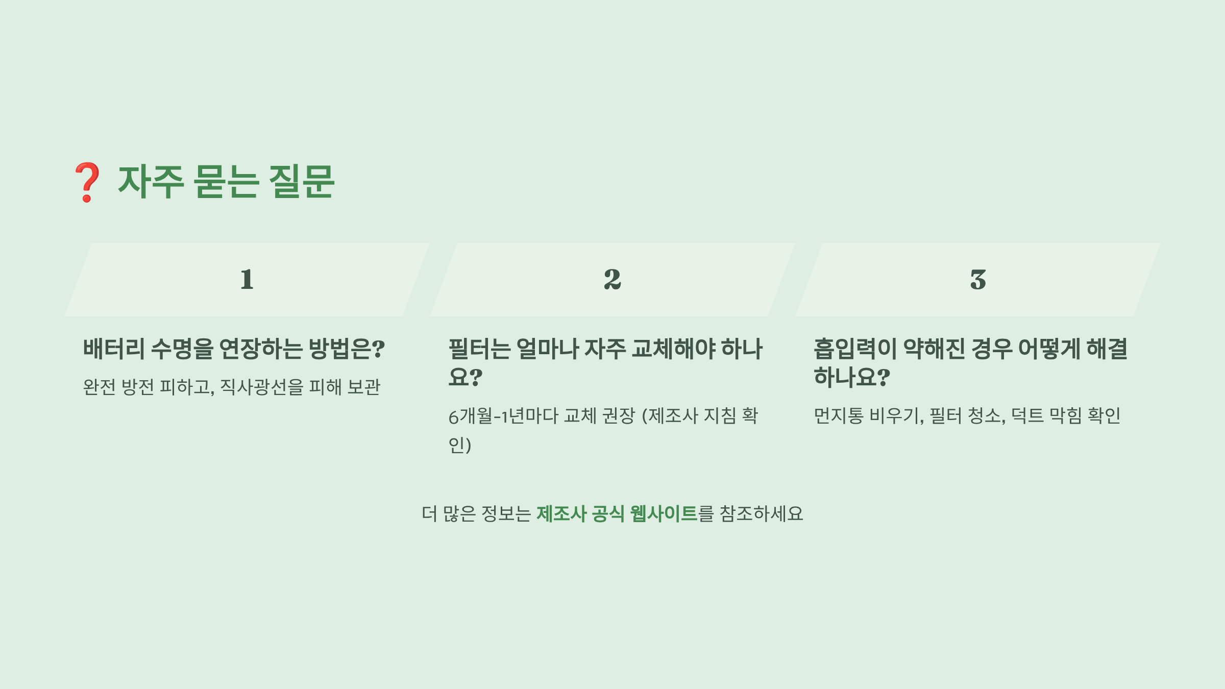 A2. 리튬이온 배터리는 보통 500-1000회 충방전이 가능해요. 매일 사용한다면 2-3년 정도 사용할 수 있어요. 배터리 수명이 다하면 사용시간이 현저히 줄어들어요. 교체형 배터리 제품을 선택하면 배터리만 교체해서 계속 사용할 수 있답니다.