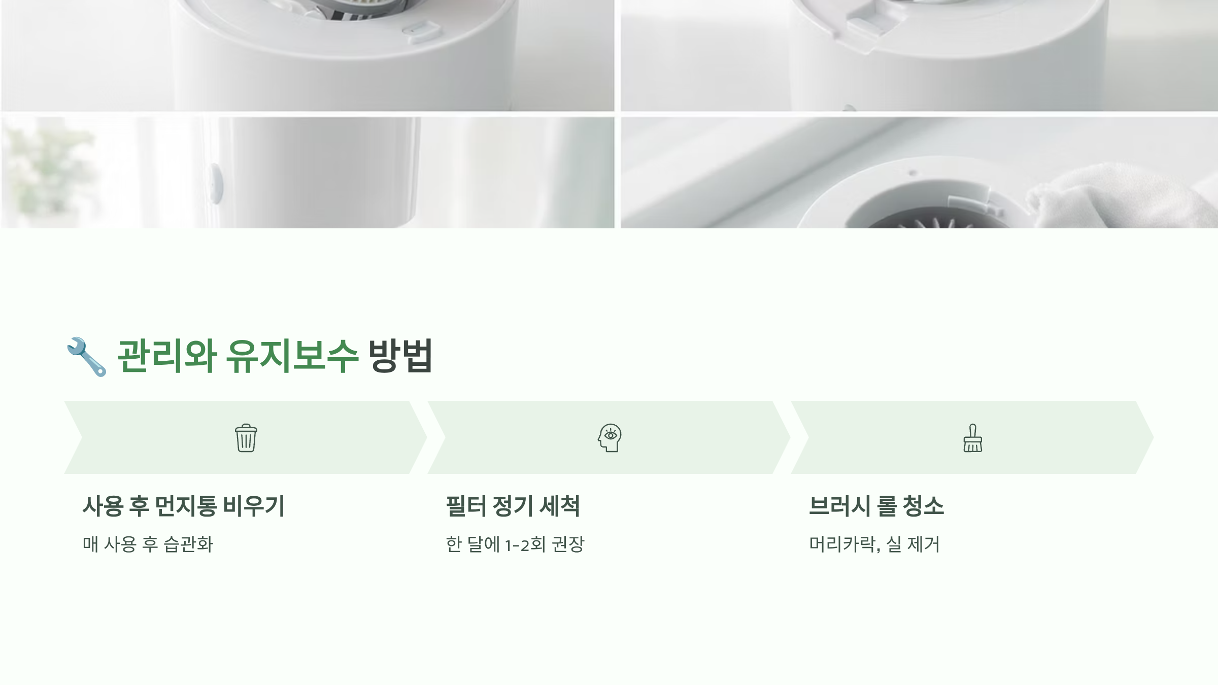 브러시 관리도 중요해요. 사용 후 브러시에 엉킨 머리카락이나 실을 제거해 주세요. 가위로 자를 때는 브러시 솔을 다치지 않게 조심해야 해요. 모터 구동 브러시는 월 1회 정도 분해해서 베어링 부분의 먼지를 제거하면 소음이 줄어들어요. 브러시가 마모되면 청소 효율이 떨어지니 1-2년마다 교체하는 것이 좋답니다.