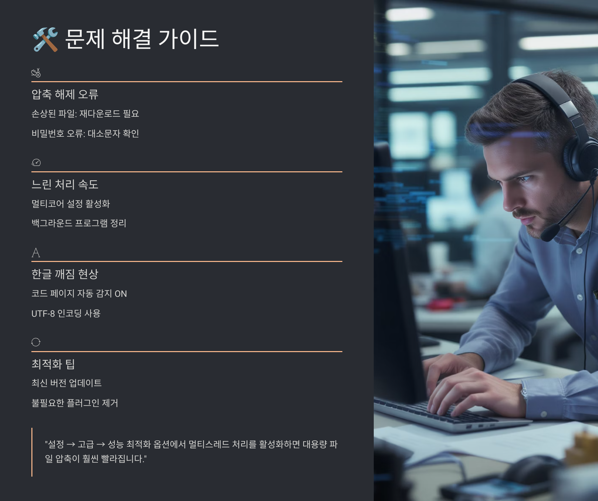 압축 해제 속도가 느려진다면 몇 가지 확인할 점이 있어요. 먼저 백신 프로그램의 실시간 검사가 방해하는지 확인하세요. 반디집을 예외 목록에 추가하면 속도가 개선돼요. 임시 폴더가 가득 차있어도 느려지니까 정기적으로 정리해 주세요. SSD 최적화 옵션을 켜고, 멀티코어 설정을 확인하는 것도 중요해요.