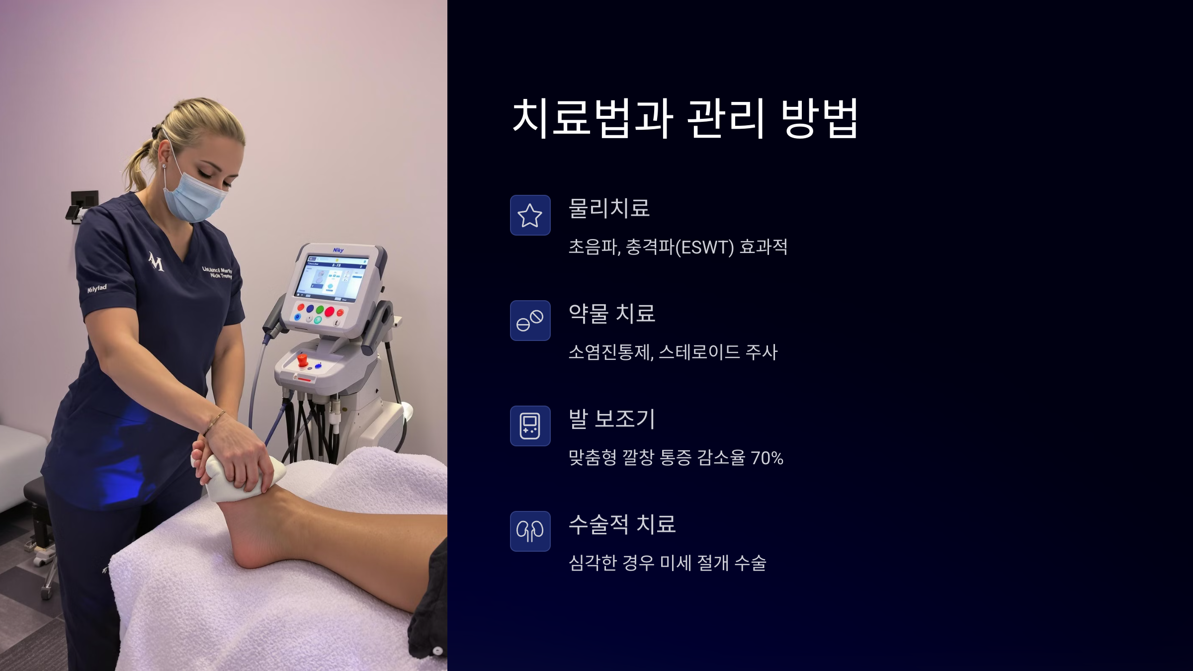 밤에는 수면 중 발의 긴장을 풀어주는 족부 스플린트(보조기)를 사용할 수도 있어요. 이는 아침에 느끼는 첫 발 통증을 완화하는 데 효과가 있어요.