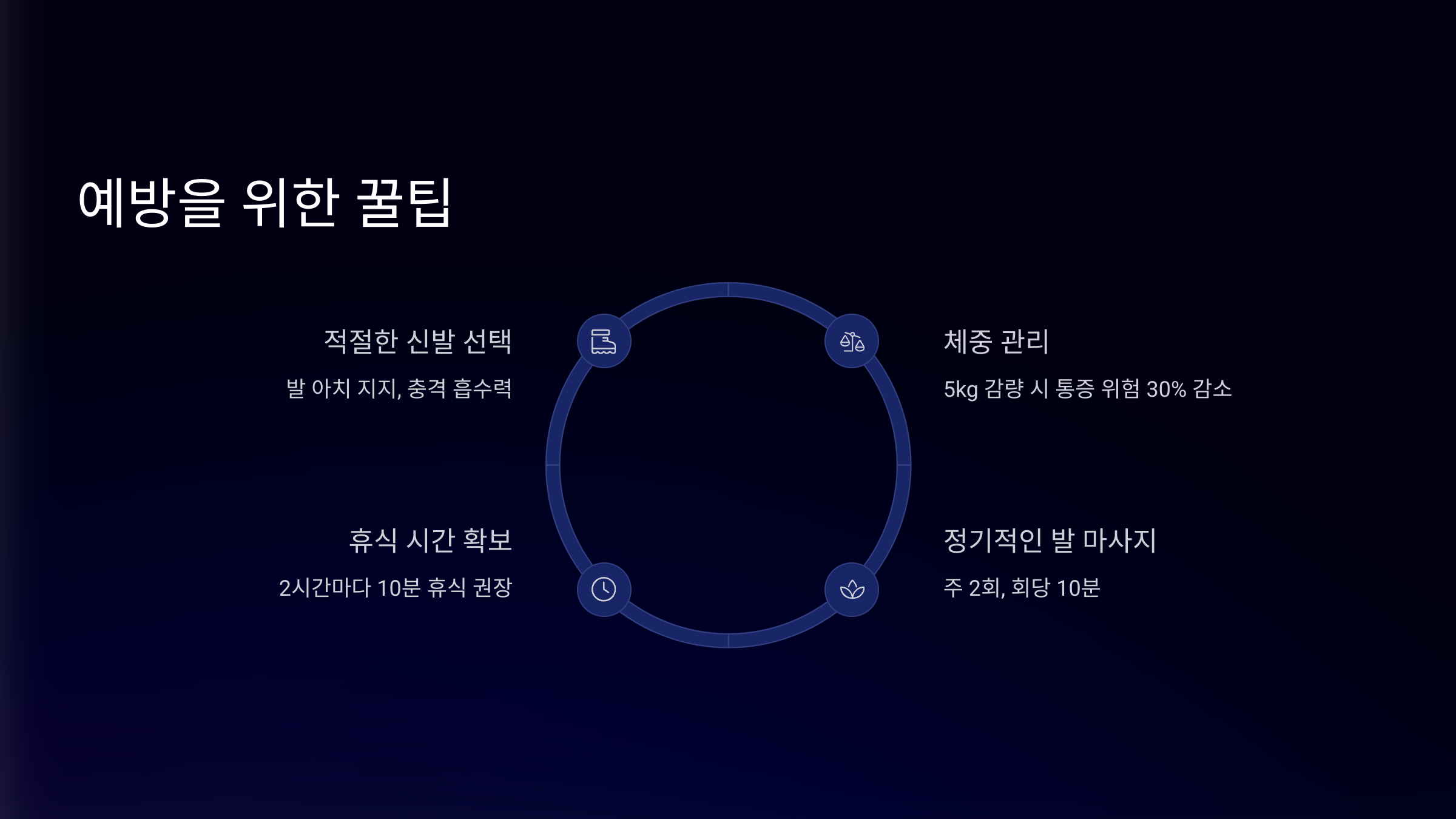 | 체중 관리 | 지속적 다이어트, 발 하중 최소화 |