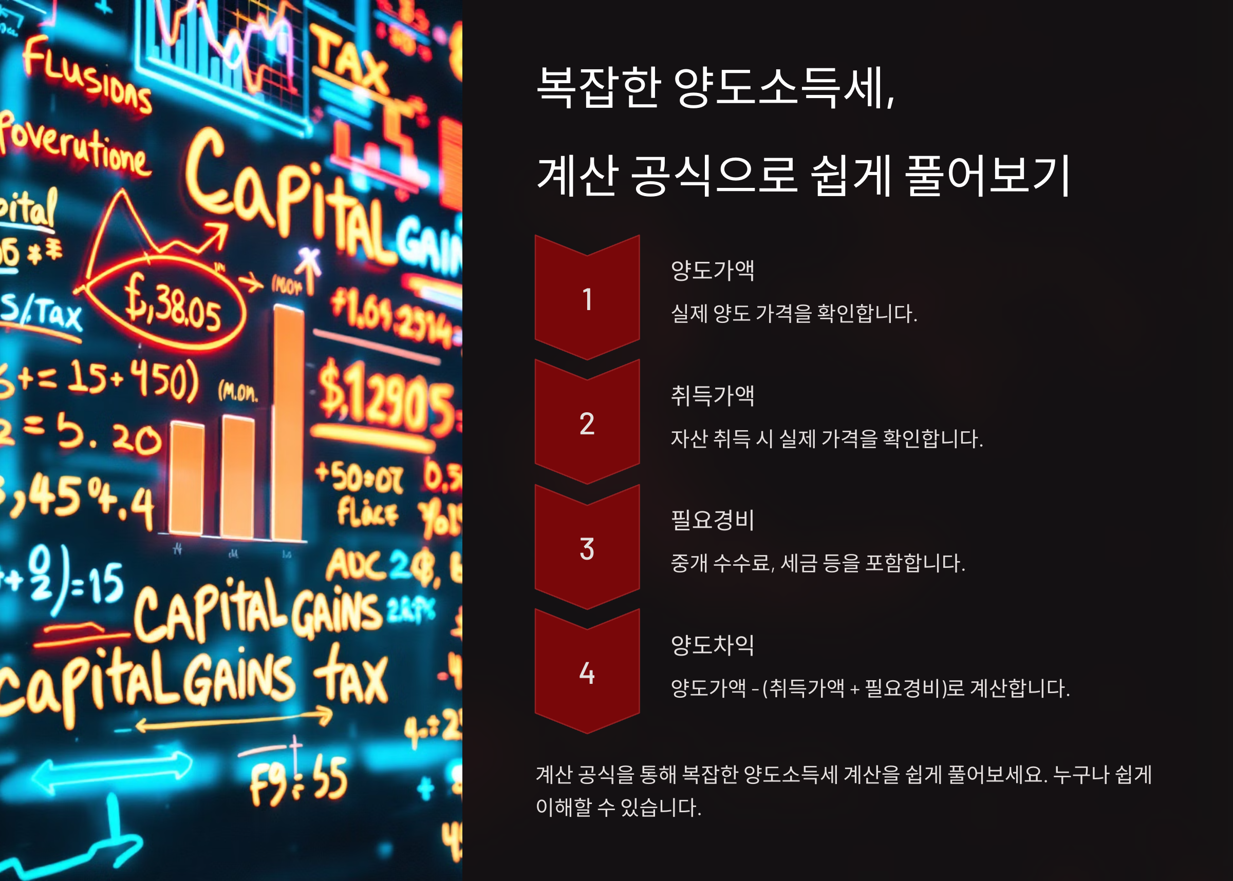 양도소득세를 계산하는 기본 공식은 다음과 같아요. 이를 이해하면 양도소득세 계산기를 사용할 때도 훨씬 쉽게 활용할 수 있어요.