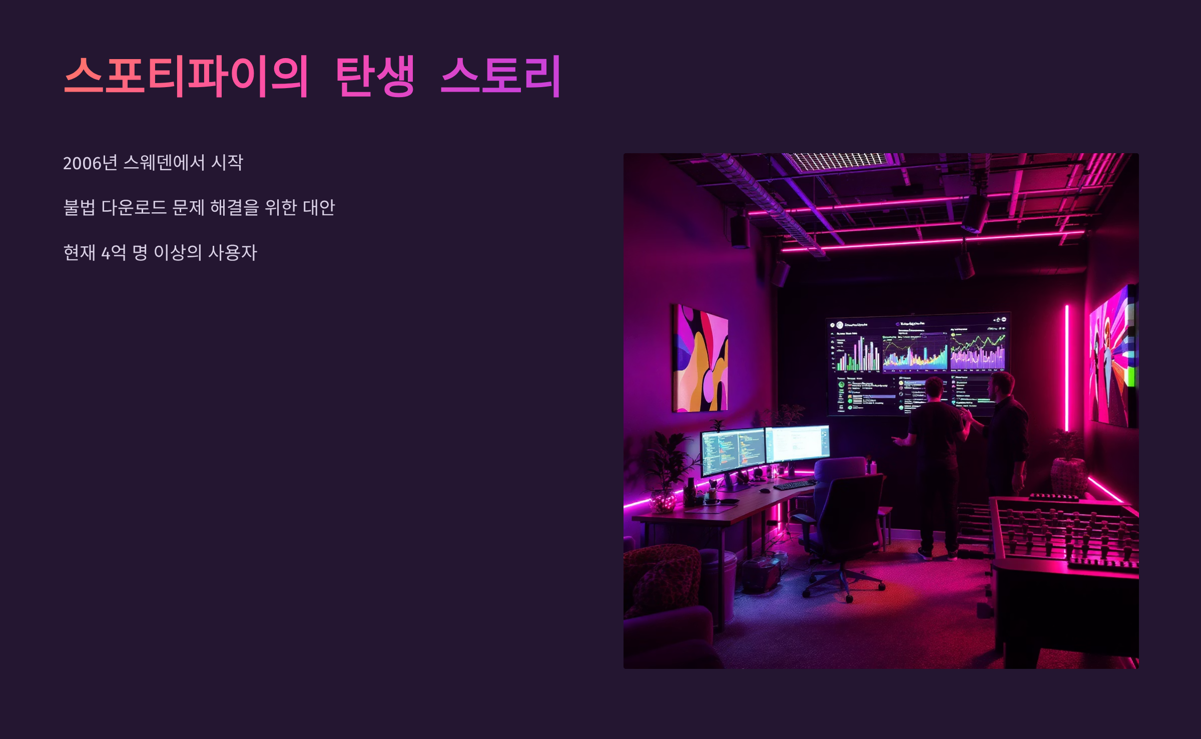 스포티파이는 2006년 스웨덴에서 시작된 음악 스트리밍 서비스로, 전 세계 음악 산업에 혁명을 일으킨 플랫폼이에요. 다니엘 에크와 마틴 로렌촌이 창업한 이 서비스는 불법 다운로드 문제를 해결하고 아티스트와 리스너 모두에게 이익이 되는 생태계를 만들어냈답니다.