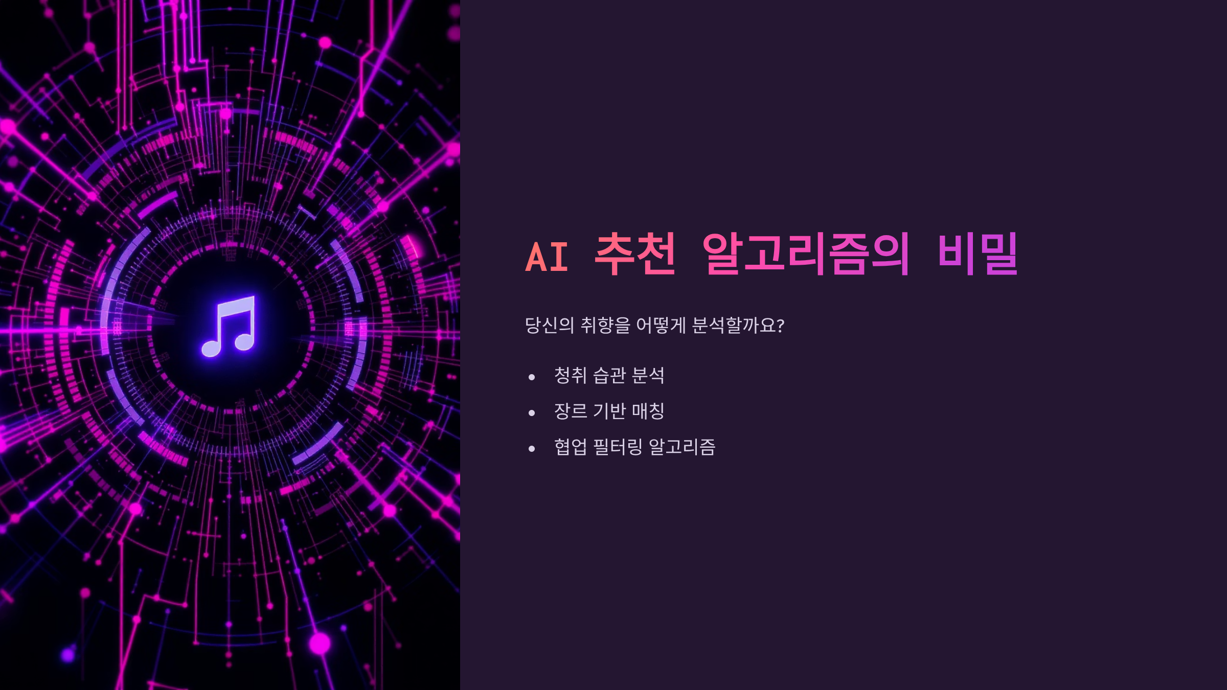 추천 알고리즘의 핵심은 세 가지 방식의 조합이에요. 첫째는 협업 필터링으로, 비슷한 취향을 가진 사용자들의 데이터를 분석해요. 둘째는 콘텐츠 기반 필터링으로, 음악의 템포, 키, 에너지 레벨 등 오디오 특성을 분석한답니다. 셋째는 자연어 처리로, 웹상의 리뷰나 블로그 포스트를 분석해서 음악에 대한 맥락을 파악해요.