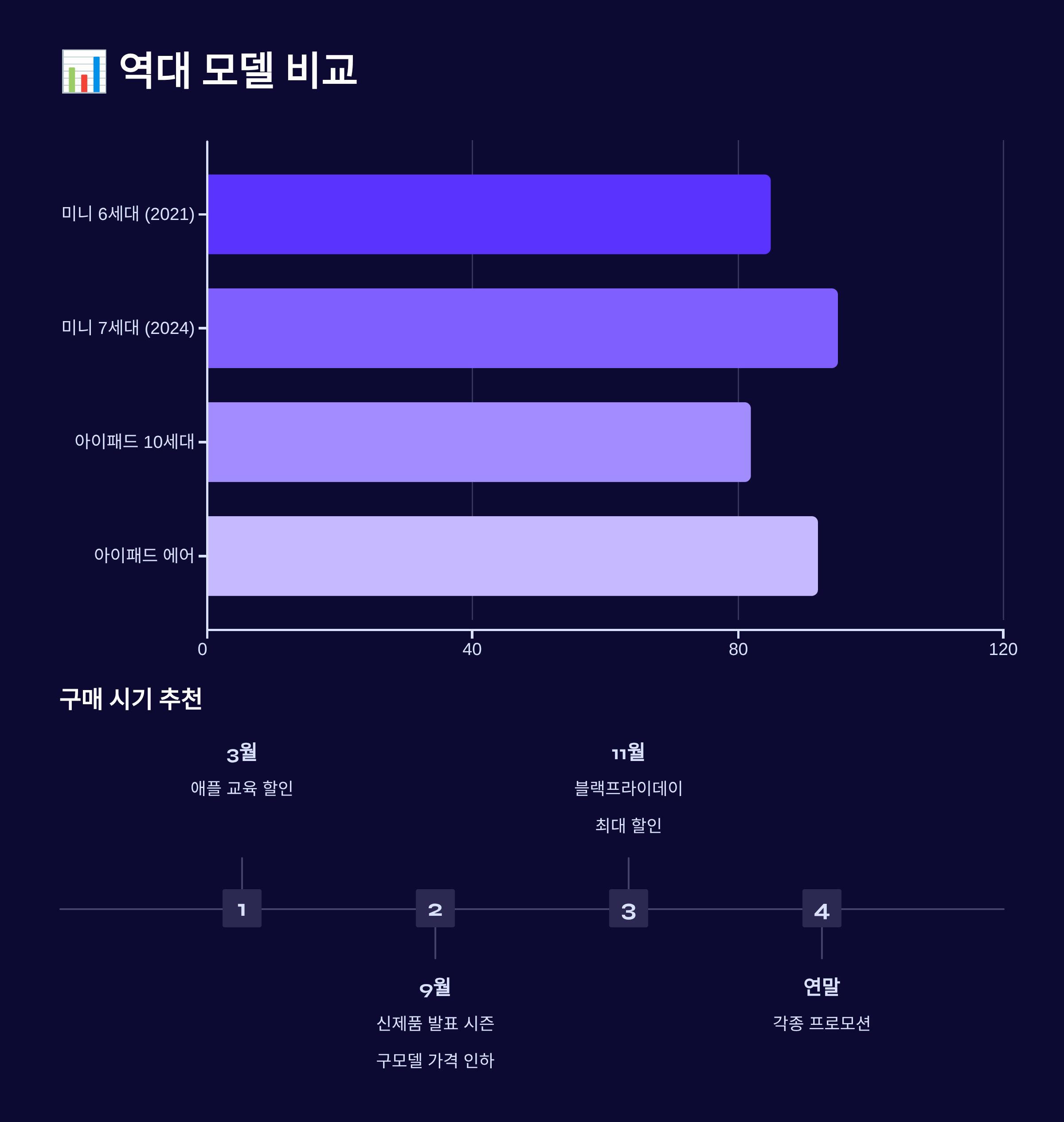 구매 시기를 결정할 때는 애플의 제품 출시 주기를 참고하면 좋아요. 아이패드미니는 보통 2-3년 주기로 업데이트되는데, 6세대가 2021년 9월에 출시되었으니 7세대는 2024년 말이나 2025년에 나올 가능성이 있어요. 새 모델 출시가 임박했다면 기다리는 것도 방법이지만, 아이패드미니는 업데이트 주기가 불규칙해서 예측이 어려워요. 필요할 때 구매하는 게 가장 현명한 선택일 수 있어요.