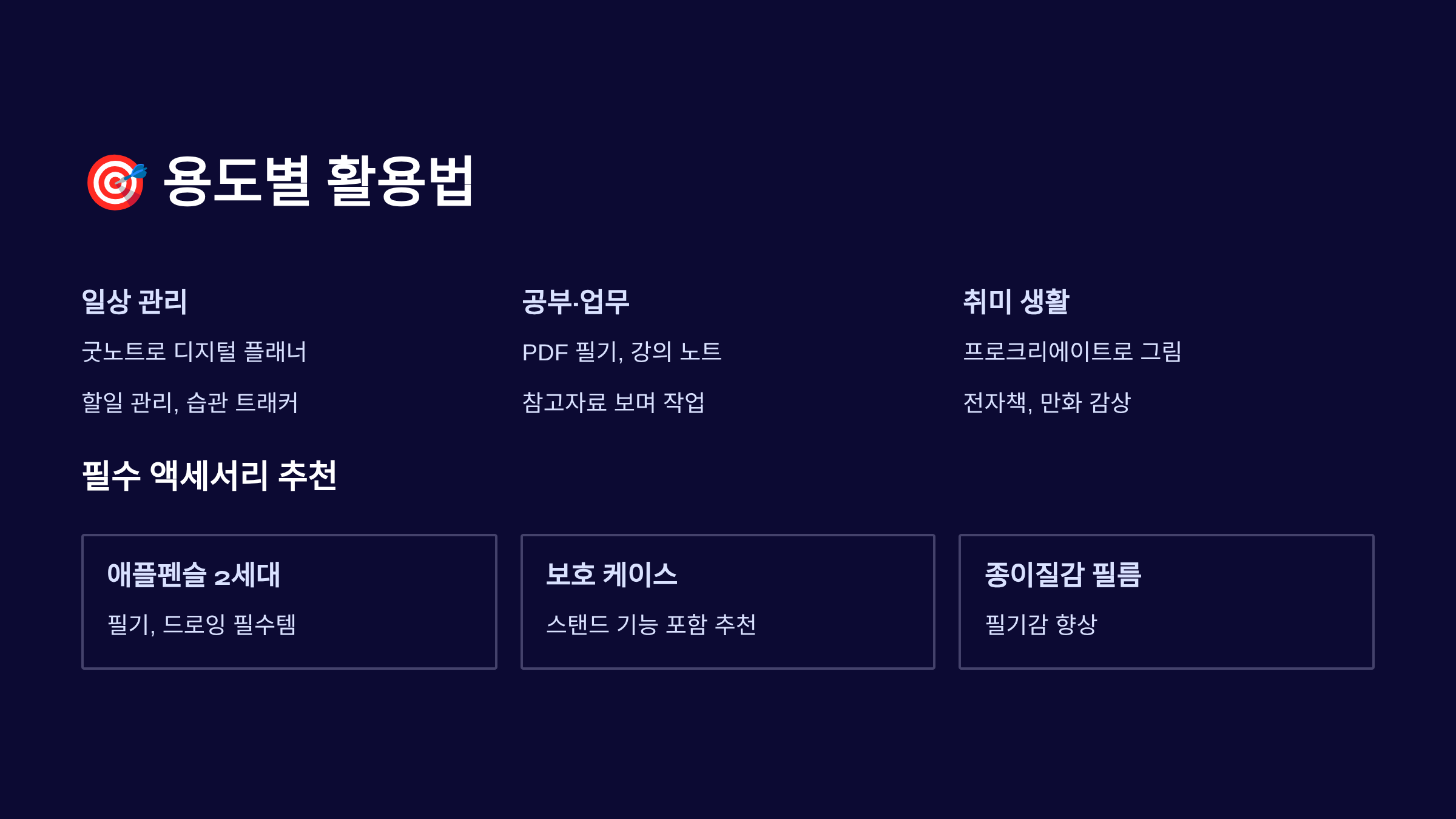 | 학습/필기 | 애플펜슬 2세대, 종이질감 필름 | 굿노트 앱, 노타빌리티 |