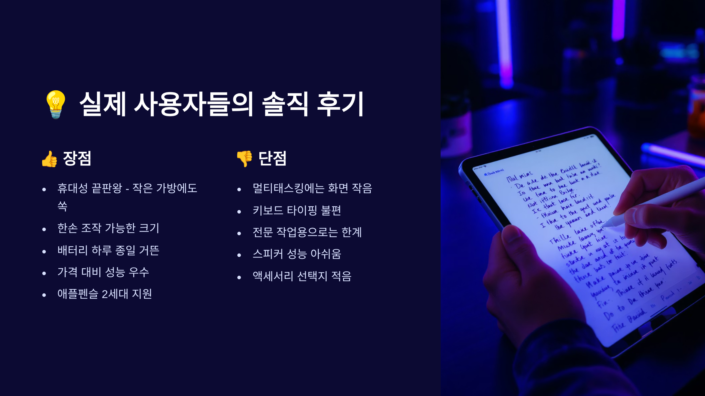 반면 단점도 분명히 존재해요. 가장 많이 지적되는 부분은 역시 화면 크기예요. 문서 작업이나 그림 그리기를 본격적으로 하려면 아무래도 작다는 느낌을 받을 수 있어요. 특히 스플릿 뷰로 두 개의 앱을 동시에 사용할 때는 각 앱의 공간이 너무 좁아져서 불편하다는 의견이 있었어요. 또한 키보드를 연결해서 사용할 때도 화면이 작아서 답답함을 느낄 수 있다고 해요.