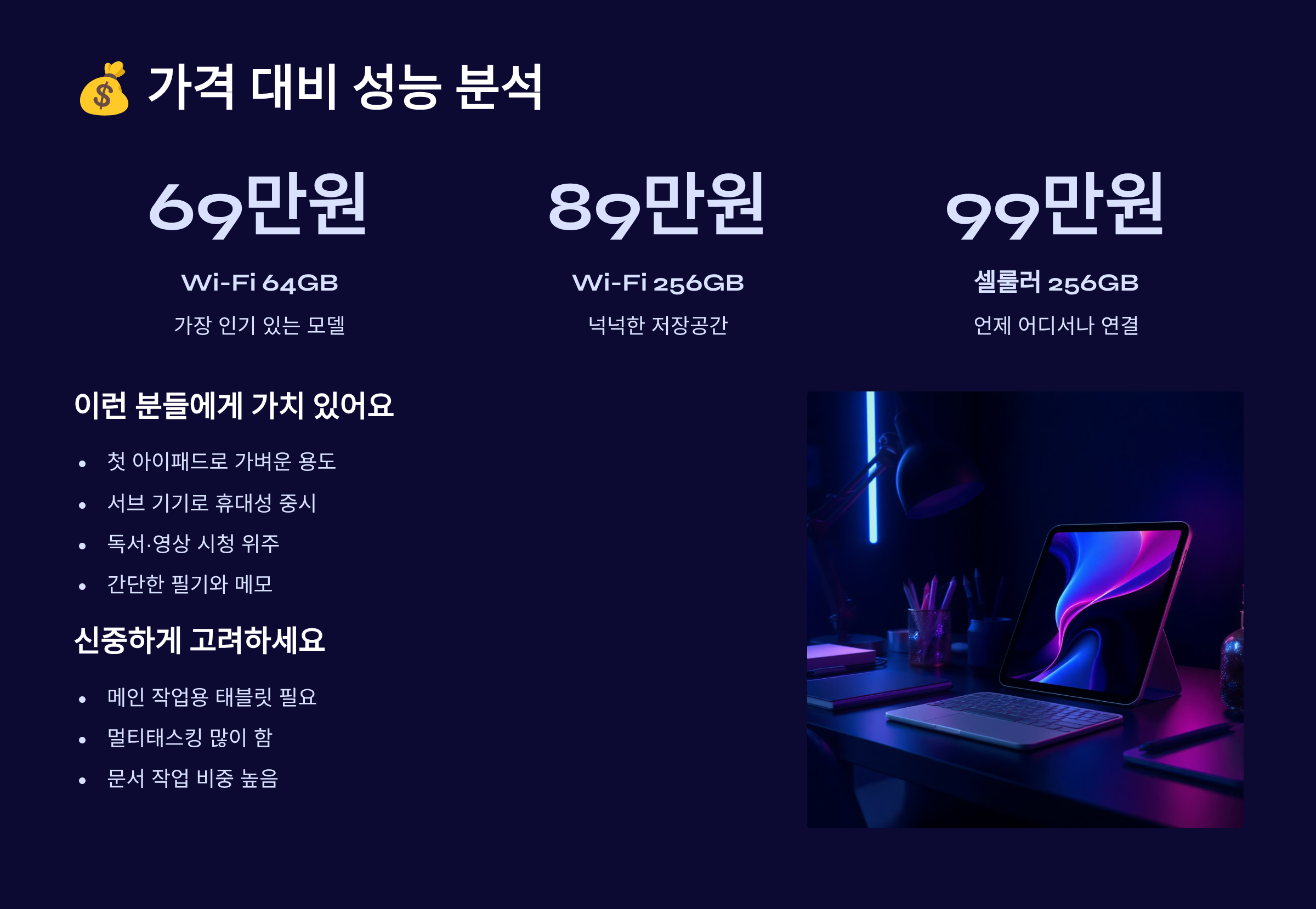 용량 선택도 가격을 좌우하는 중요한 요소예요. 64GB와 256GB의 가격 차이가 19만 원인데, 실제로 64GB로도 충분한 경우가 많아요. 클라우드 서비스를 활용하고 스트리밍 위주로 사용한다면 64GB도 괜찮아요. 하지만 영상 편집이나 대용량 게임을 많이 한다면 256GB를 선택하는 게 나을 수 있어요. 나중에 용량이 부족해서 기기를 바꾸는 것보다는 처음부터 넉넉하게 구매하는 게 경제적일 수도 있답니다.