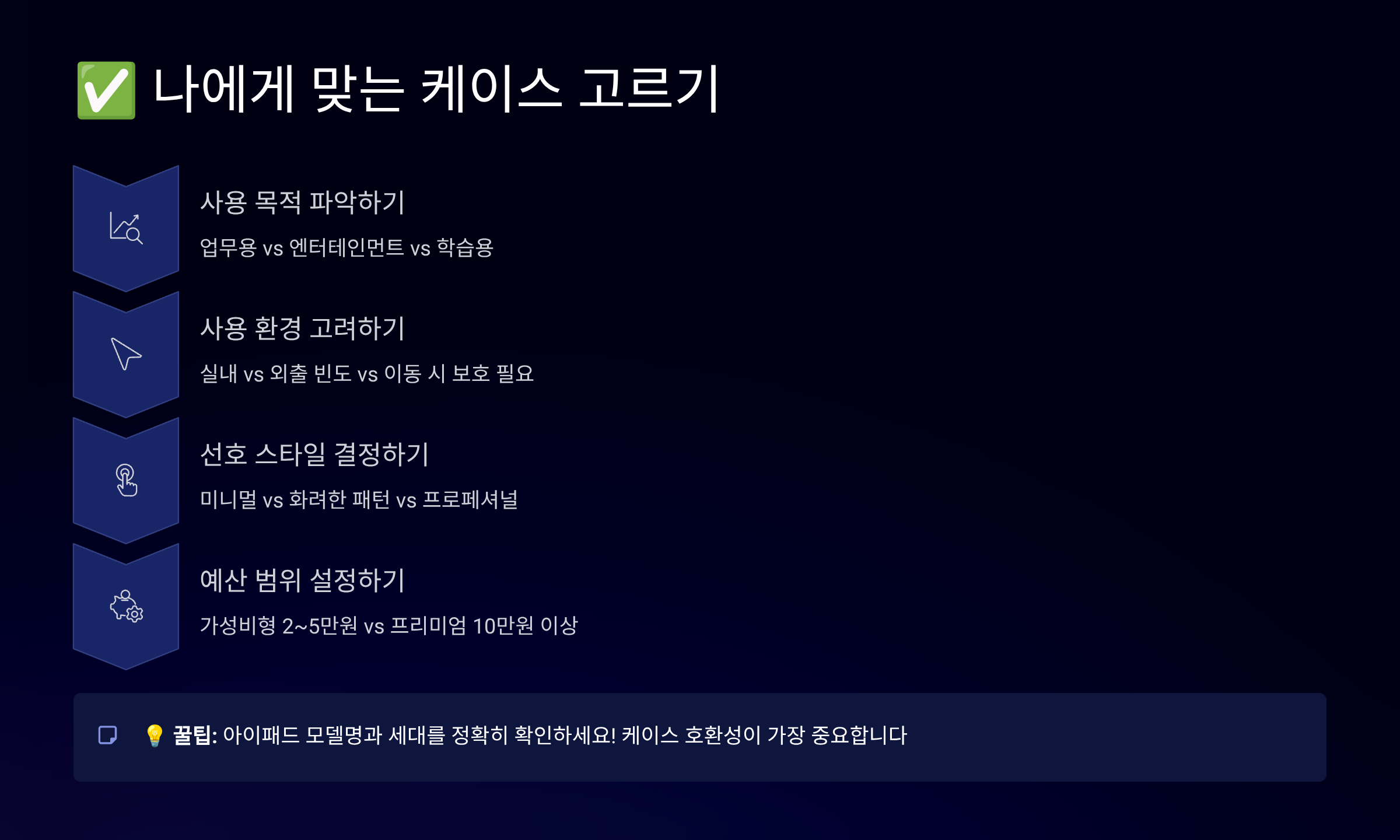 아이패드 케이스를 선택할 때는 먼저 자신의 사용 패턴을 파악하는 것이 중요해요. 주로 집에서 사용한다면 스탠드 기능이 뛰어난 케이스를, 외출이 잦다면 보호력이 강한 케이스를 선택하는 것이 좋아요. 직업이나 취미 활동도 고려해야 할 요소예요. 예를 들어 그래픽 디자이너라면 애플펜슬 수납이 편리한 케이스가 필수겠죠.