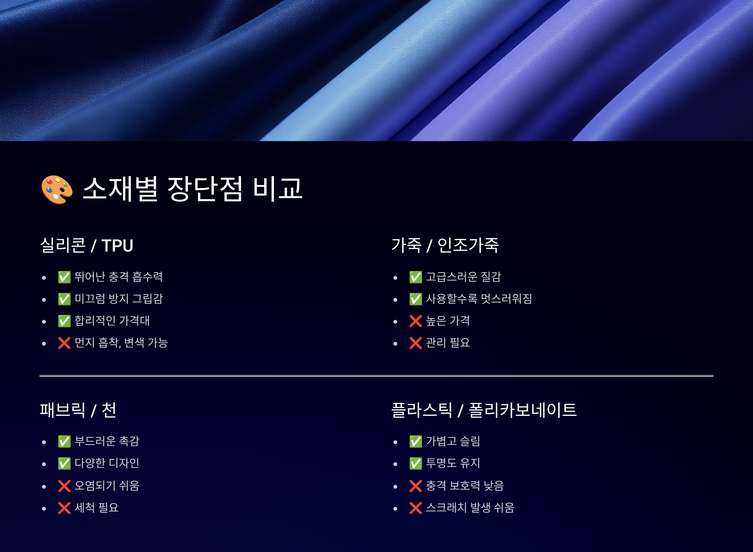 실리콘 소재는 부드러운 촉감과 뛰어난 그립감이 특징이에요. 미끄러운 표면에서도 안정적으로 놓을 수 있고, 떨어뜨렸을 때 충격을 효과적으로 흡수해요. 리퀴드 실리콘 케이스는 특히 프리미엄 제품으로 분류되며, 먼지가 잘 붙지 않는 특수 코팅 처리가 되어 있답니다. 다만 흰색 실리콘의 경우 시간이 지나면 누렇게 변색될 수 있어요.