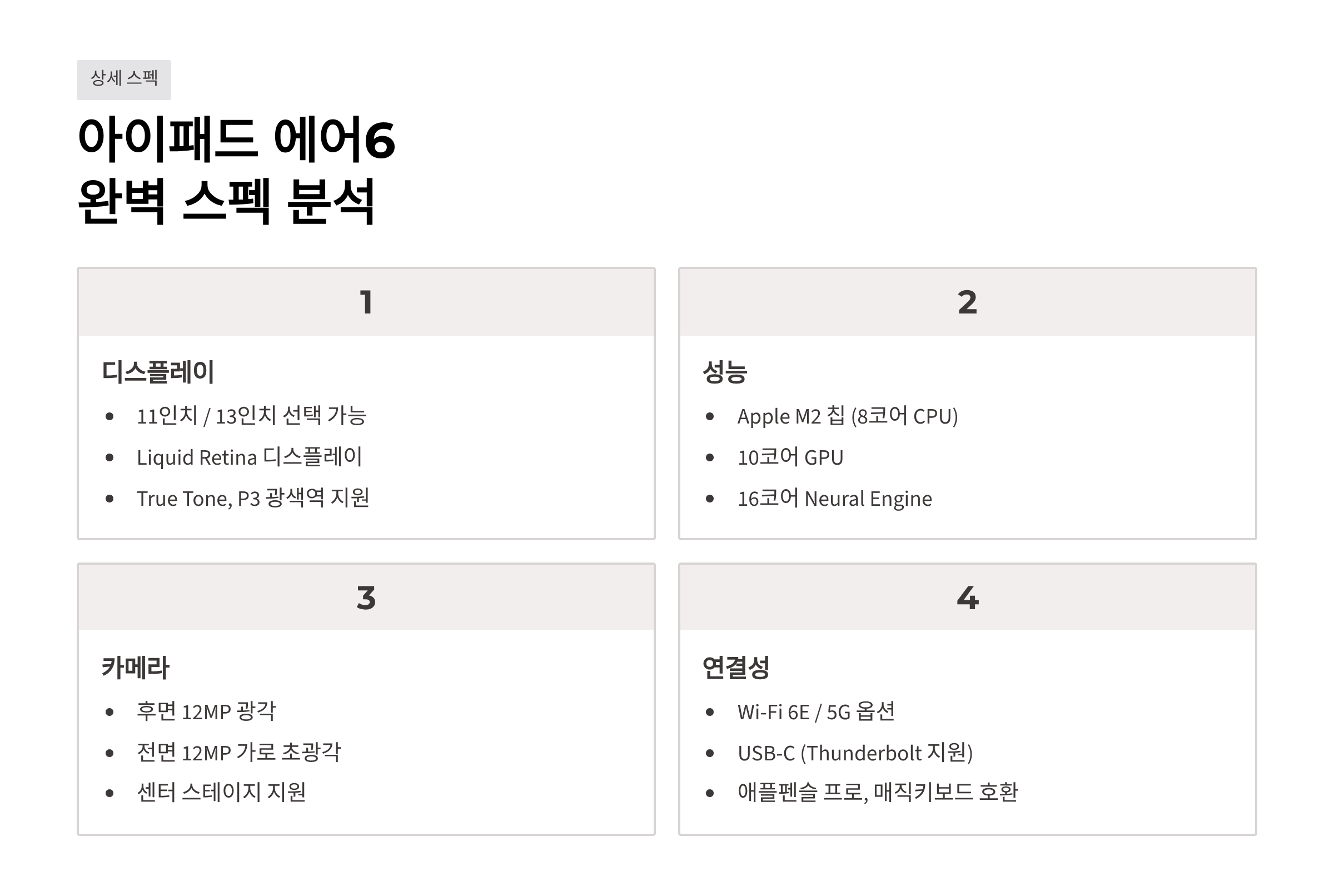 이제 아이패드 에어 6의 상세 스펙을 꼼꼼하게 살펴볼게요. 먼저 프로세서부터요. M2 칩은 5 나노미터 공정으로 제조되었고, 8 코어 CPU(성능 코어 4개 + 효율 코어 4개)와 9 코어 GPU를 탑재하고 있어요. 이 구성은 고성능 작업과 배터리 효율성을 동시에 잡아주는 최적의 조합이에요.