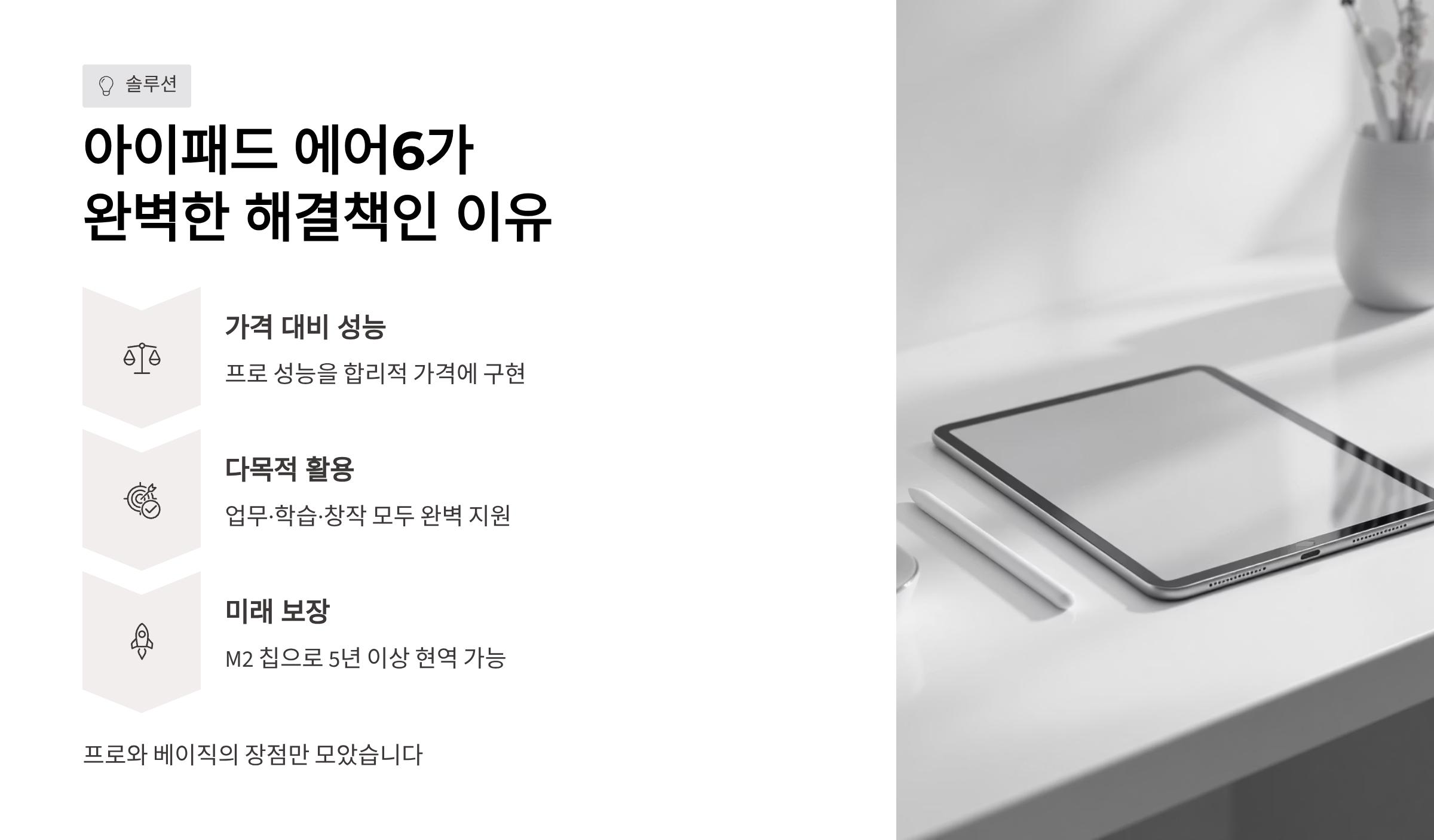 앞서 언급한 고민들을 아이패드 에어 6가 어떻게 해결해 주는지 살펴볼게요. 먼저 성능과 가격의 균형 문제부터요. M2 칩은 프로 모델의 M4 칩보다는 한 단계 낮지만, 대부분의 작업에서 체감 차이가 크지 않아요. 4K 영상 편집, 복잡한 그래픽 작업도 무리 없이 처리할 수 있답니다.