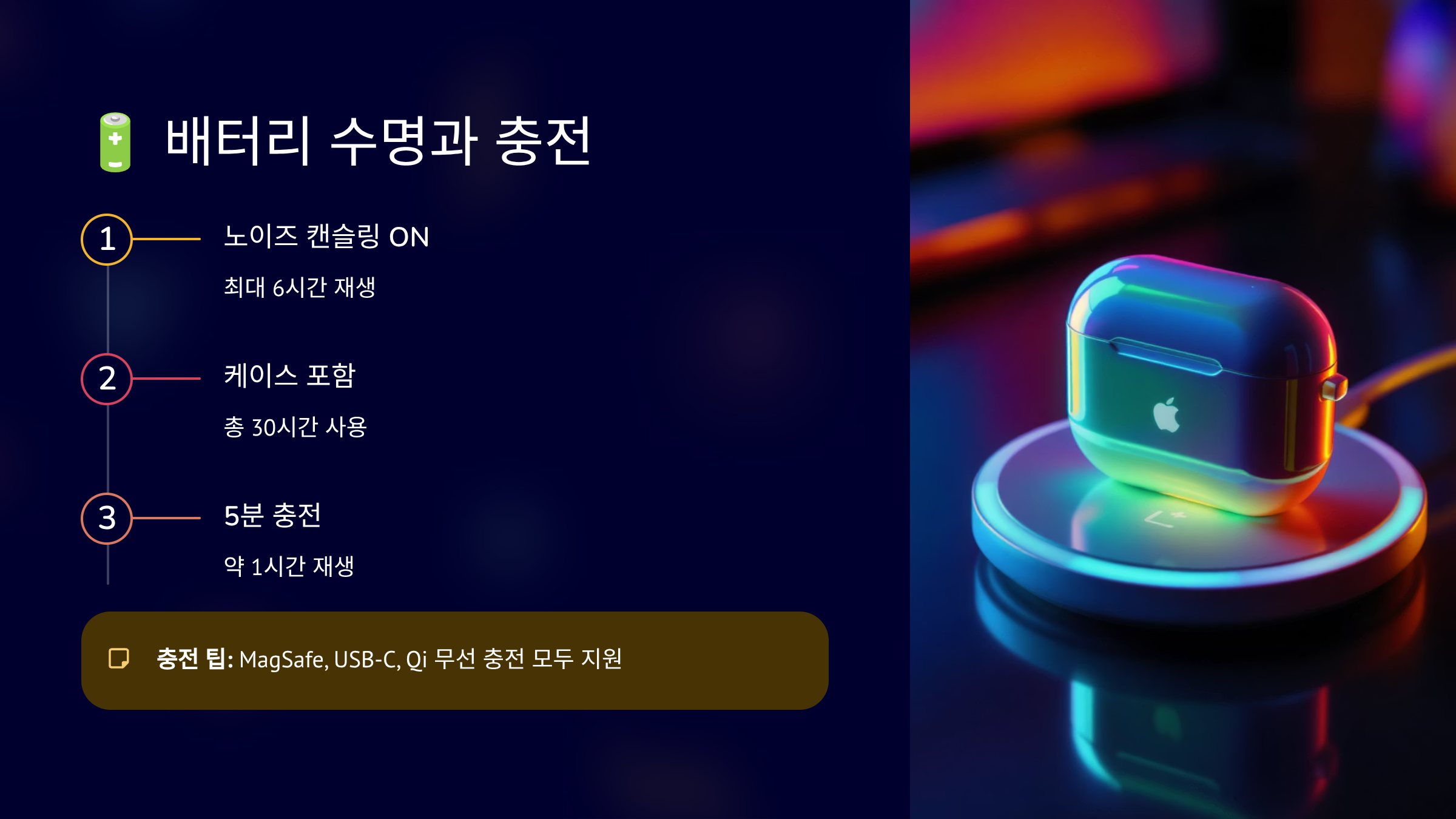 에어팟프로 2세대의 배터리 수명은 정말 인상적이에요. 노이즈 캔슬링을 켠 상태에서 최대 6시간, 충전 케이스를 포함하면 총 30시간 사용이 가능하답니다. 공간 음향과 헤드 트래킹을 켜면 약 5.5시간 정도로 줄어들지만, 일상적인 사용에는 충분한 수준이에요.