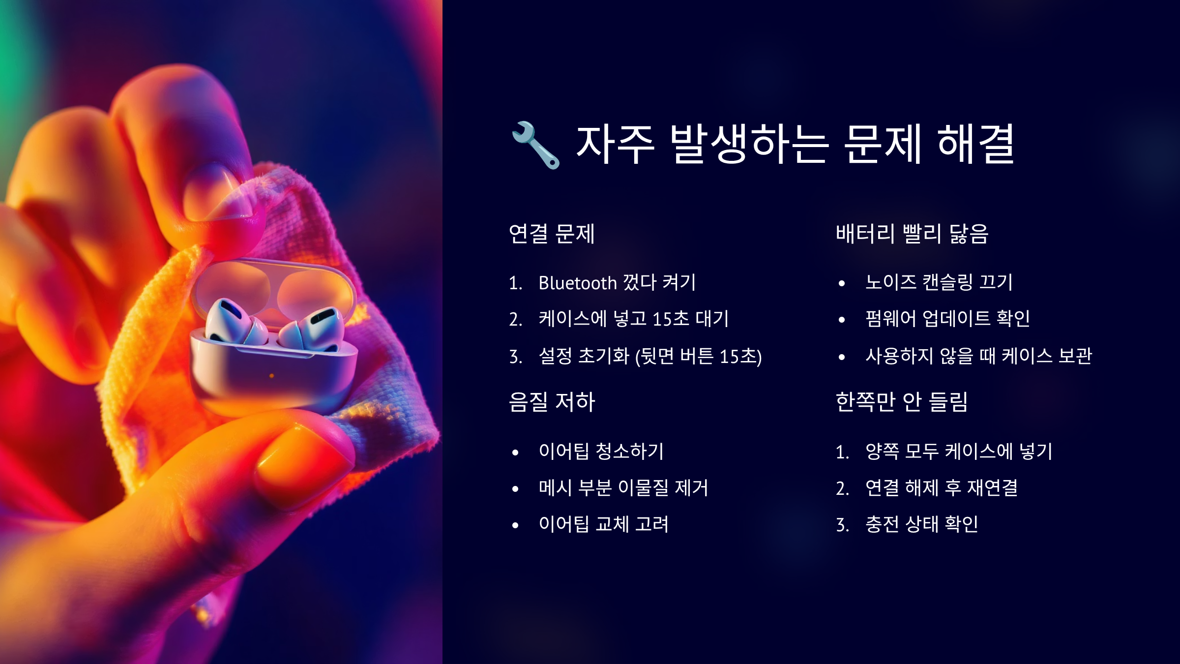 개인적으로 경험한 팁은 정기적인 청소가 정말 중요하다는 거예요. 한 달에 한 번씩 이어폰과 케이스를 깨끗이 청소하면 대부분의 문제를 예방할 수 있답니다. 특히 여름철에는 땀 때문에 더 자주 청소해 주는 게 좋아요! 🔨