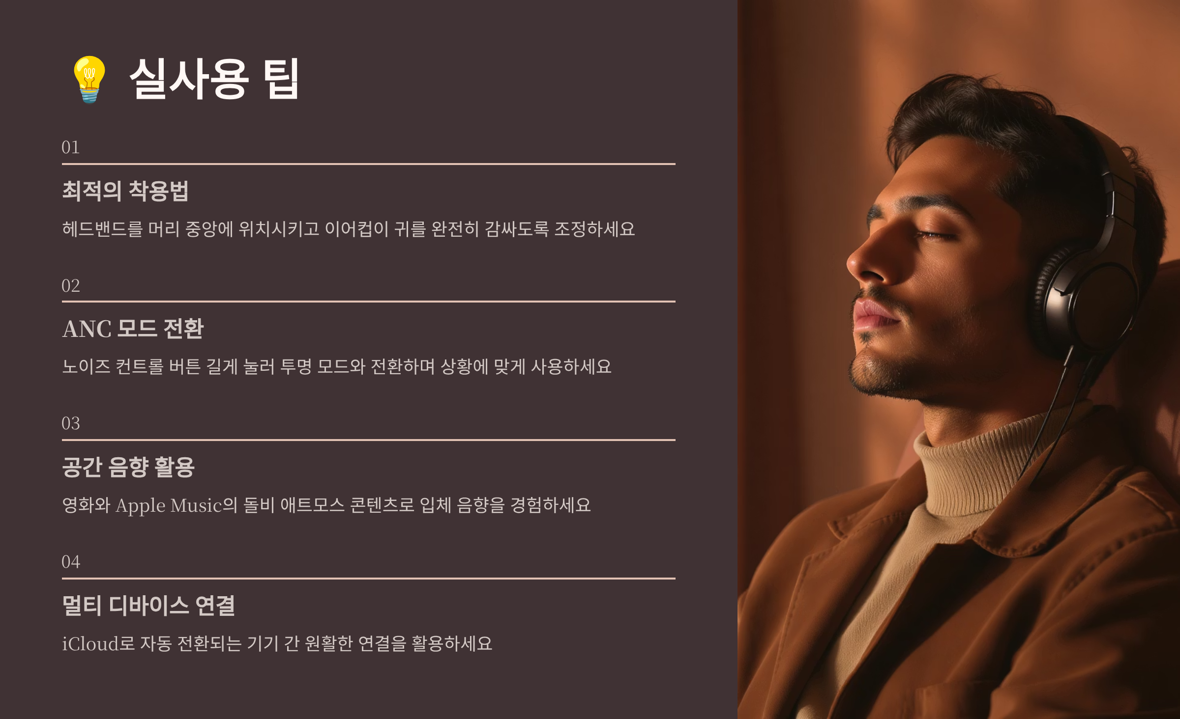 빌드 퀄리티는 정말 압도적이에요. 스테인리스 스틸과 알루미늄을 사용한 프레임은 튼튼하면서도 고급스러워 보여요. 이어 쿠션과 헤드밴드는 쉽게 분리해서 교체할 수 있어서 오래 사용할 수 있답니다. 애플 특유의 미니멀한 디자인은 어떤 스타일에도 잘 어울려요. 색상별로 느낌이 달라서 패션 아이템으로도 손색이 없어요. 💫