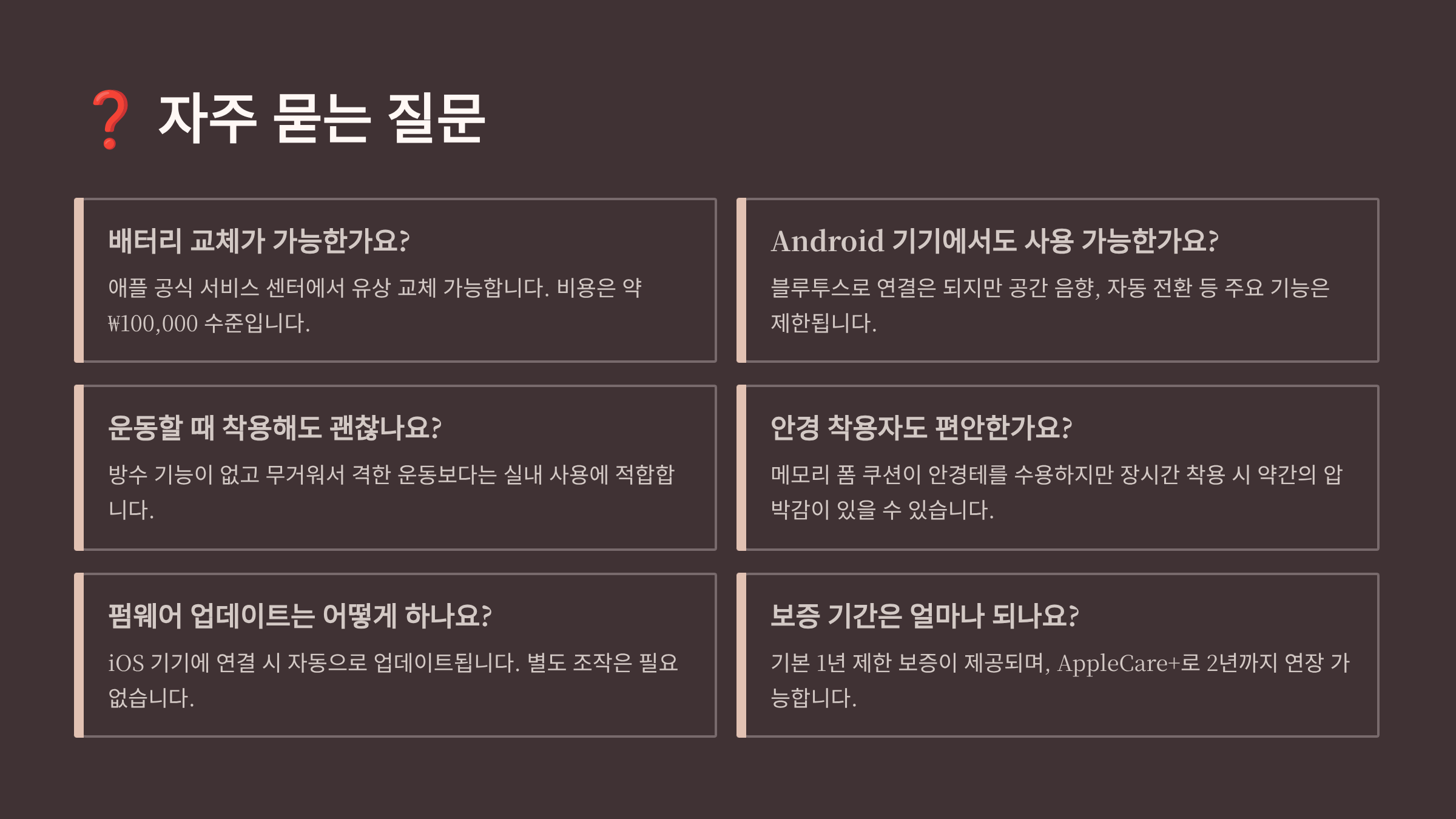A3. 가벼운 운동은 가능하지만 격한 운동에는 적합하지 않아요. 385g의 무게 때문에 뛰거나 점프하면 흔들리고, 땀에 대한 방수 기능도 없어요. 헬스장에서 웨이트 트레이닝 정도는 괜찮지만, 러닝이나 사이클링에는 에어팟 프로가 더 적합해요. 🏃♂️