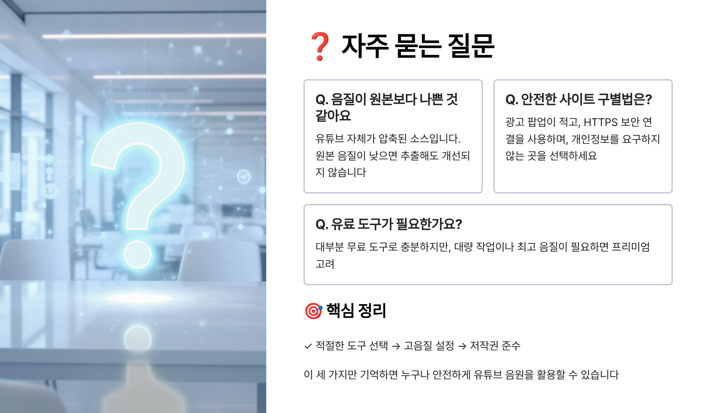 A2. 먼저 원본 영상의 품질을 확인하세요. 4K 영상은 보통 256 kbps AAC 오디오를 포함해요. youtube-dl이나 4K Video Downloader로 원본 품질 그대로 추출하는 것이 가장 좋아요. 온라인 변환 사이트는 재인코딩으로 품질이 떨어질 수 있어요. Opus 포맷이 최신이지만, 호환성을 위해서는 320 kbps MP3나 256 kbps AAC를 추천해요.