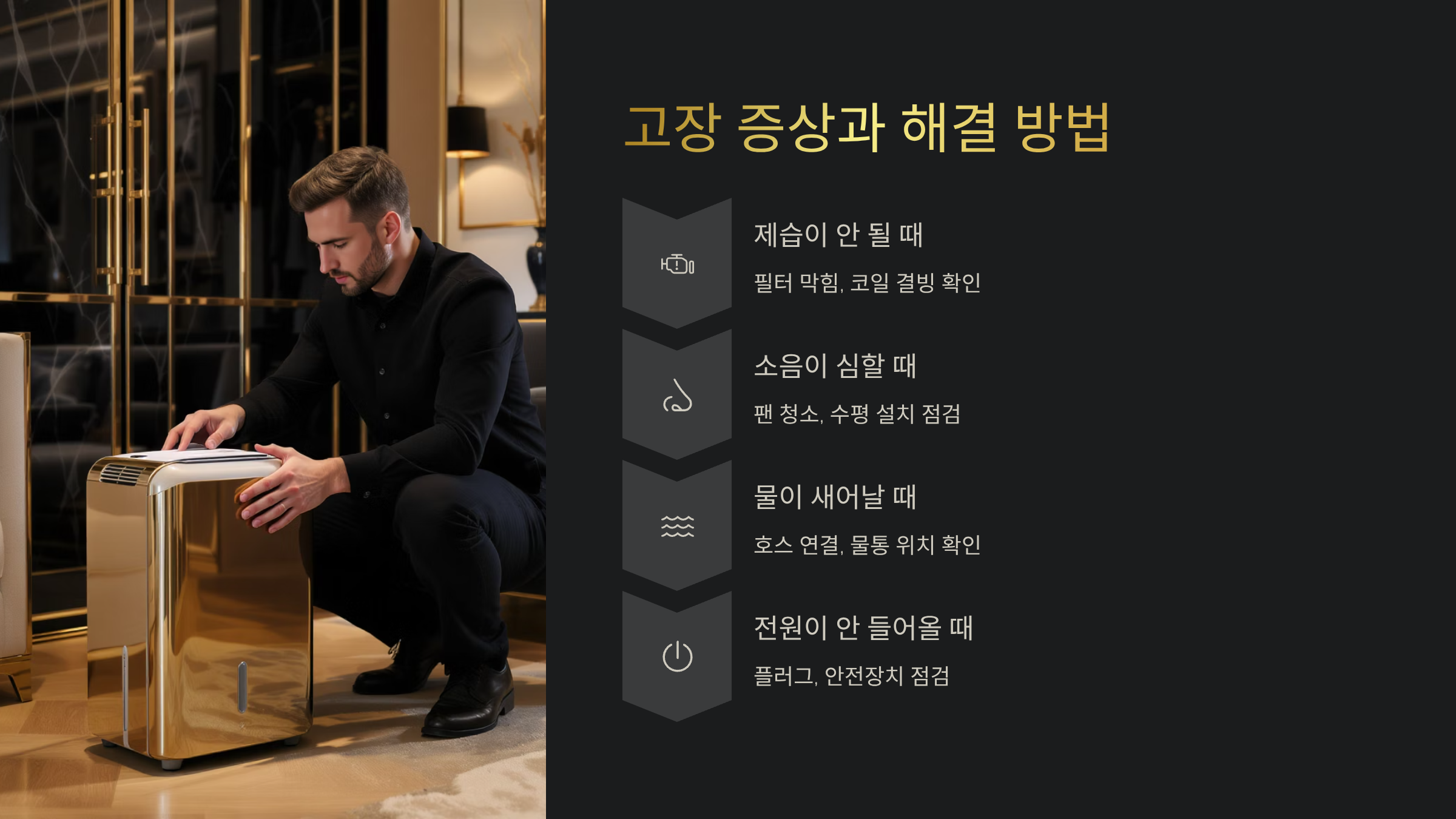 | 제습 효율 저하 | 필터 막힘/냉매 부족 | 필터 청소/냉매 충전 | 냉매는 전문가 필요 |