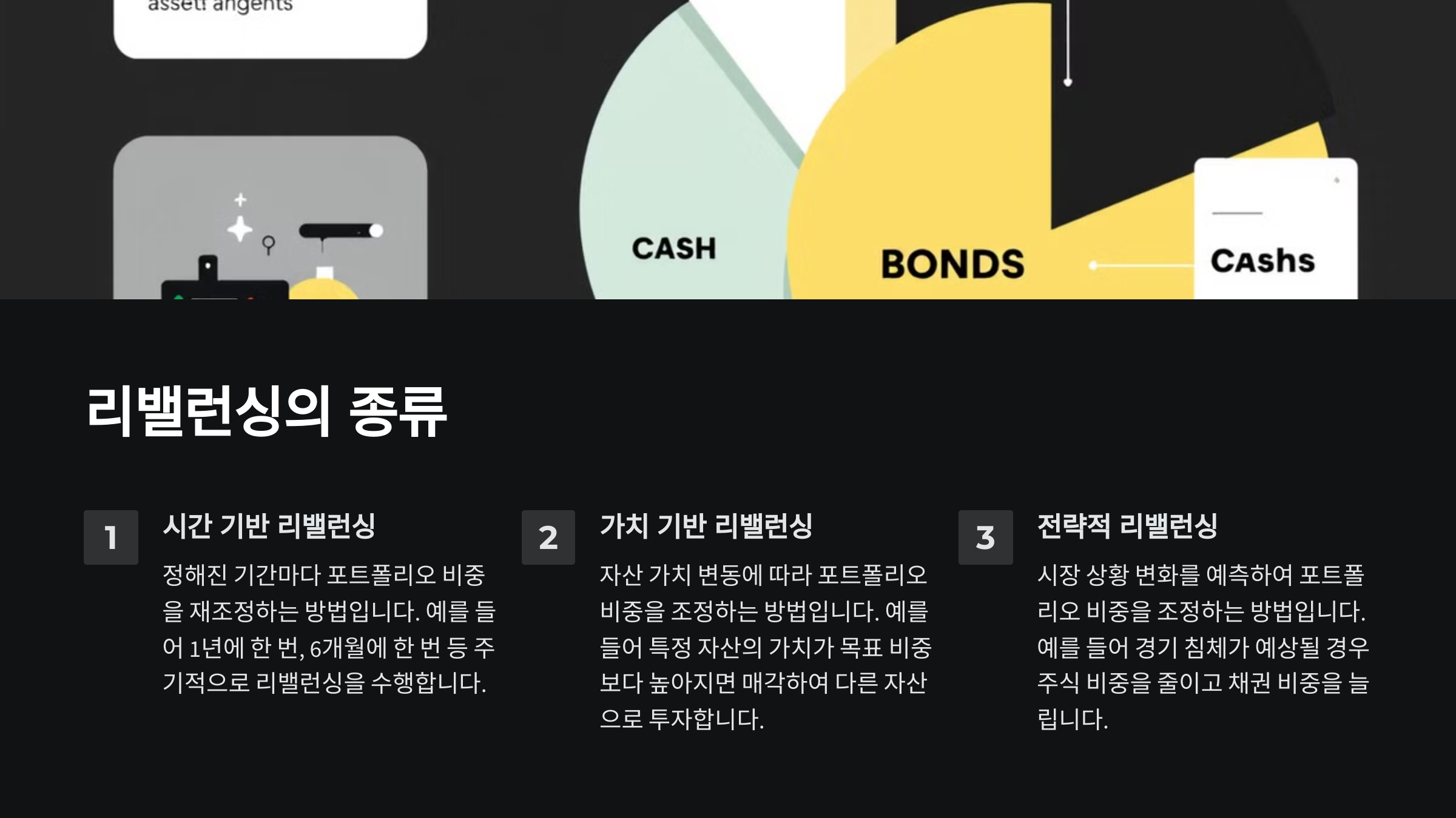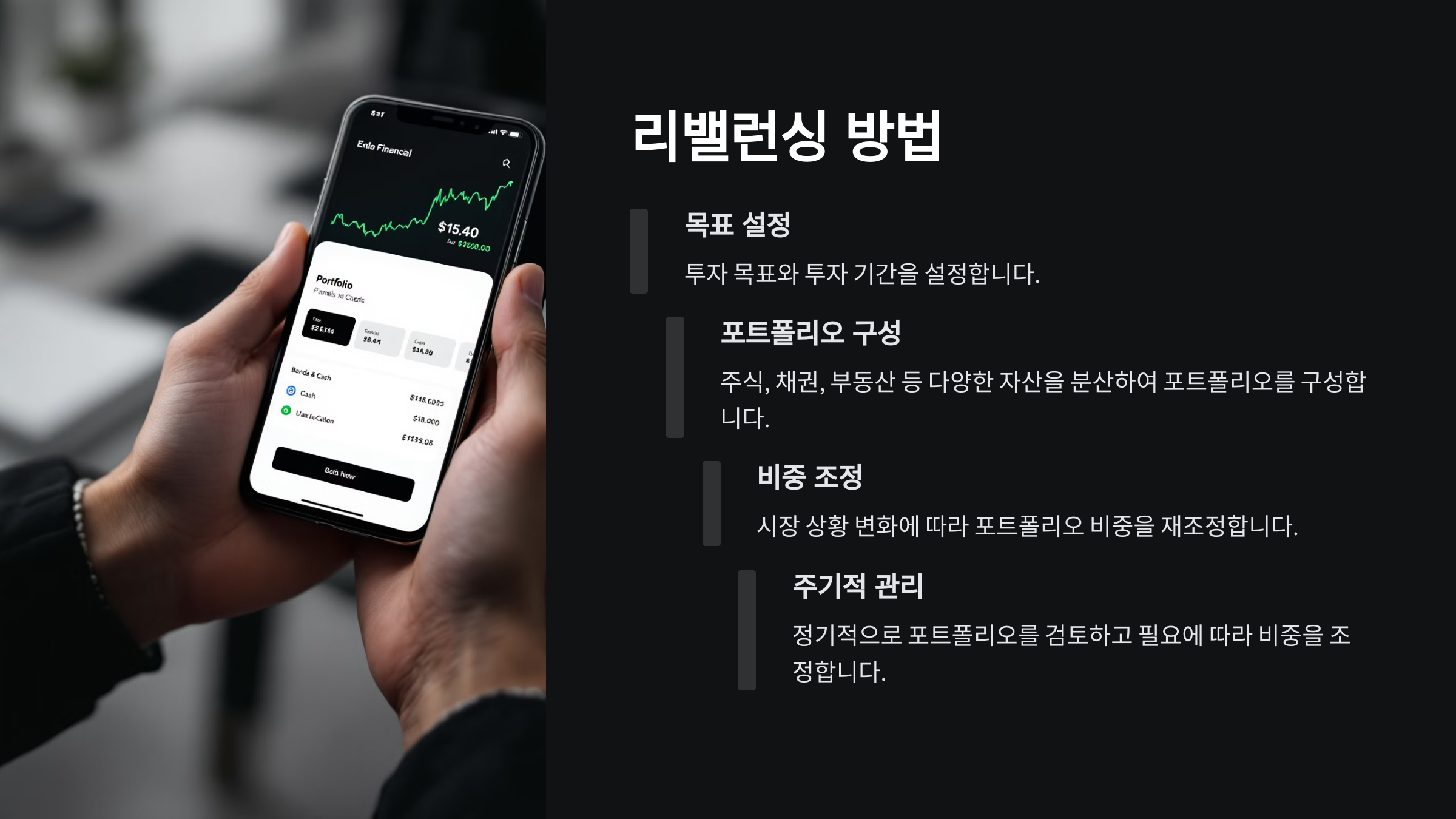 | 주기적 리밸런싱 | 정해진 일정(예: 분기별, 연간)마다 자산 비율을 조정 | 관리 용이, 규칙적인 투자 | 시장 변동 반영이 늦을 수 있음 |