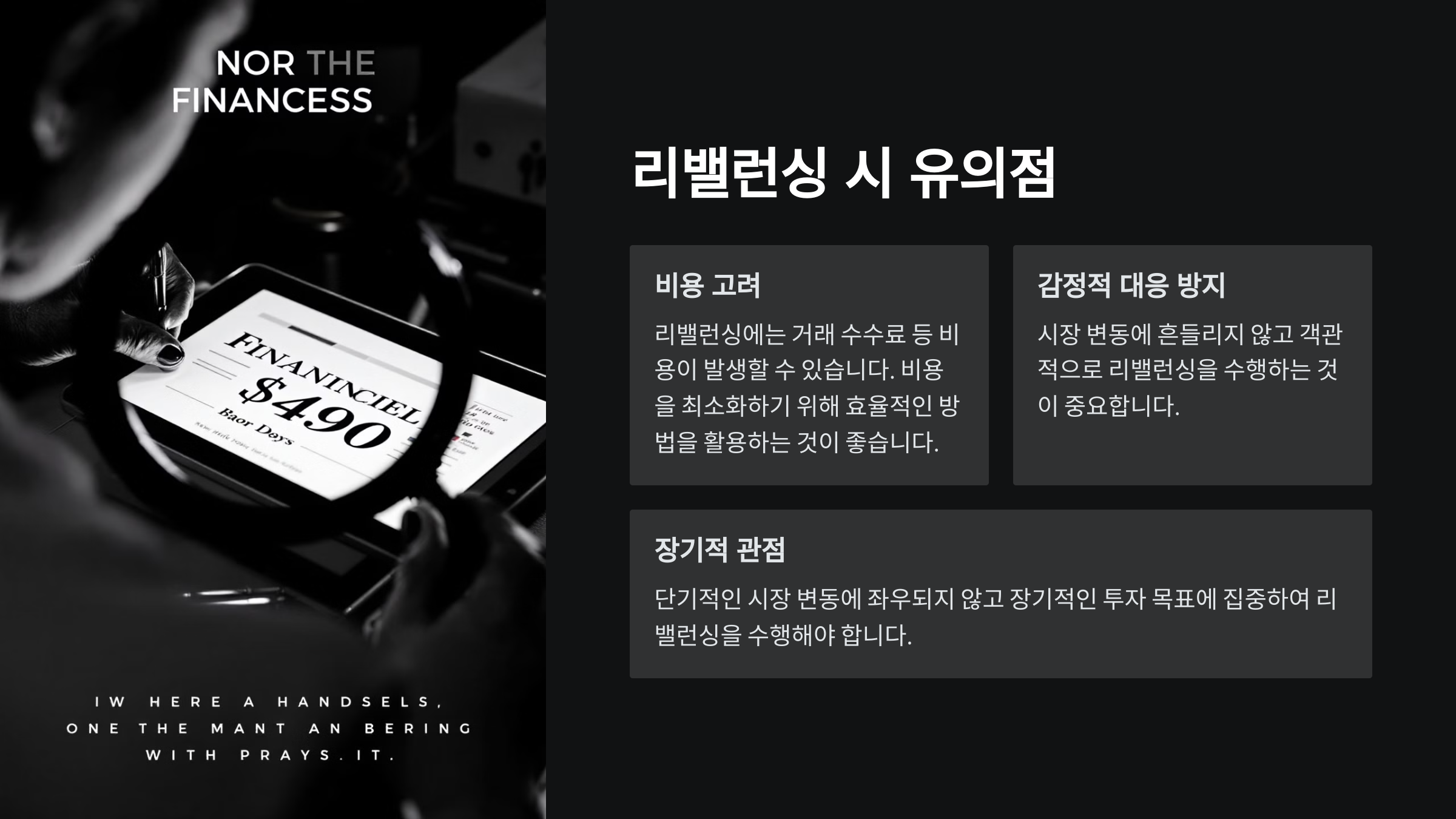 리밸런싱을 할 때 다음과 같은 점을 유의하면 더욱 효과적인 전략을 세울 수 있어요.